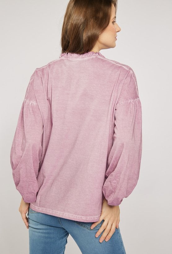 Bluzka damska z bufiastymi 3/4 rękawami wykończonymi ściągaczem. Bluzka z dekoltem półokrągłym z rozcięciem i wiązaniem. Bluzka na ramionach z ozdobną koronką. Model ten z pewnością sprawdzi się na wiele okazji. Modelka na zdjęciu ma 177 cm wzrostu i prezentuje rozmiar 36.
