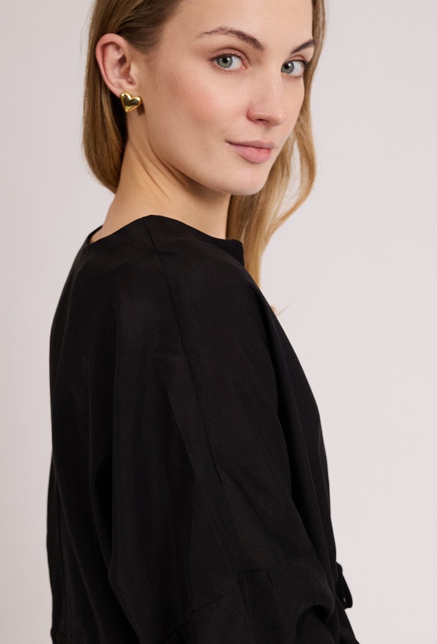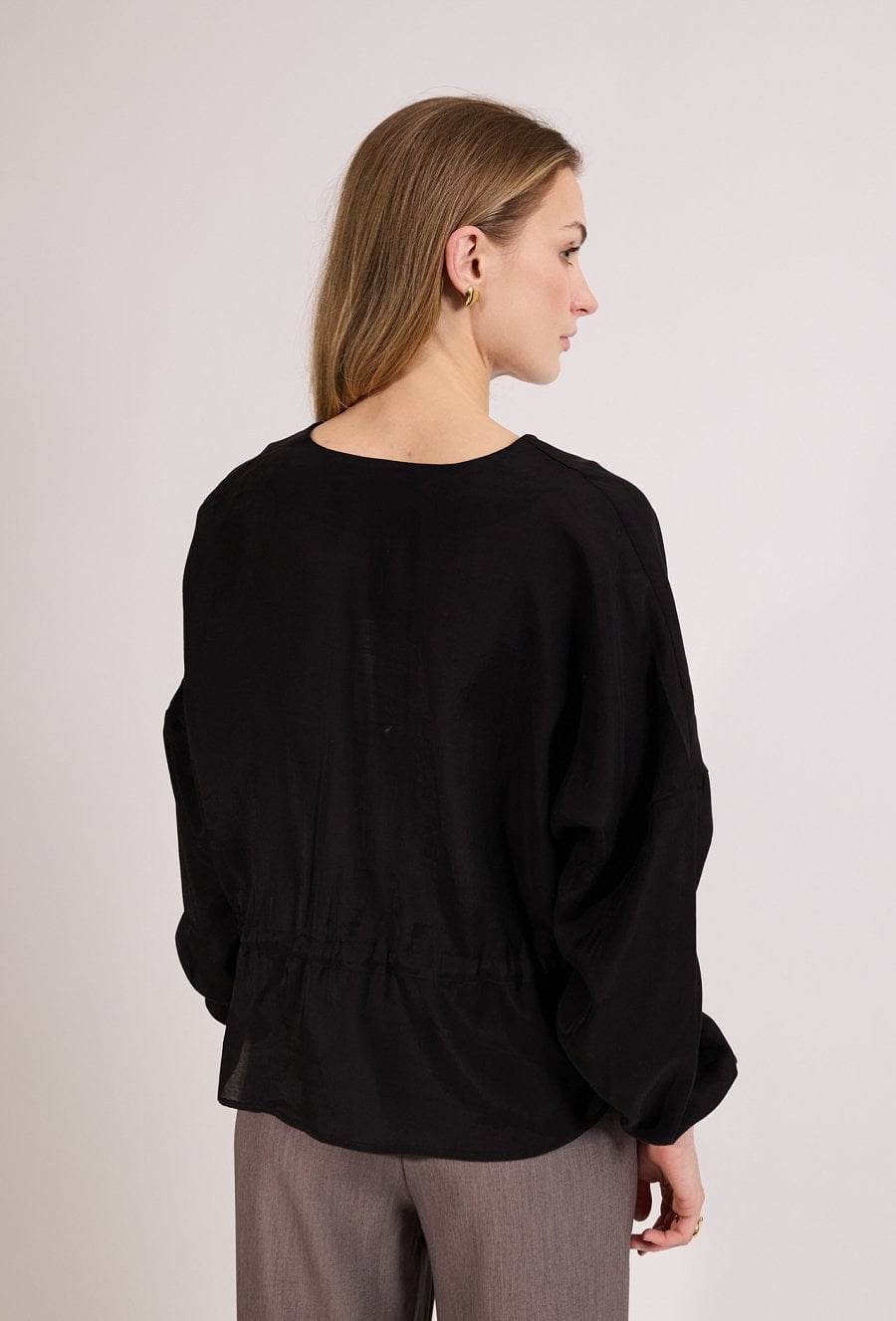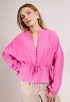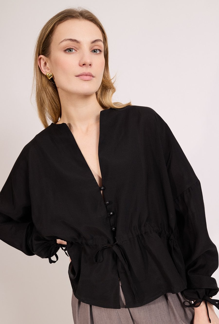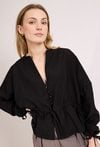 Stylowa bluzka damska o luźnym kroju z długim rękawem. Model zapinany na guziki z dekoltem w kształcie litery V oraz wiązaniem w talii, które podkreśla sylwetkę. Bluzka doskonale sprawdzi się w codziennych i eleganckich stylizacjach, na spotkania oraz wyjścia. Modelka na zdjęciu ma 177 cm wzrostu i prezentuje rozmiar S/M.