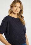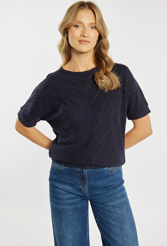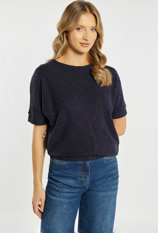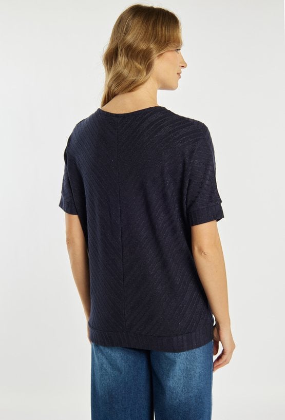 Bluzka damska o nowoczesnym, minimalistycznym charakterze. Model o swobodnym kroju z krótkim rękawem oraz klasycznym, zabudowanym dekoltem. Bluzka z delikatną, strukturalną fakturą i ukośnym wzorem nadaje całości subtelnej elegancji i wyjątkowego wyglądu. Modelka na zdjęciu ma 177 cm wzrostu i prezentuje rozmiar S.