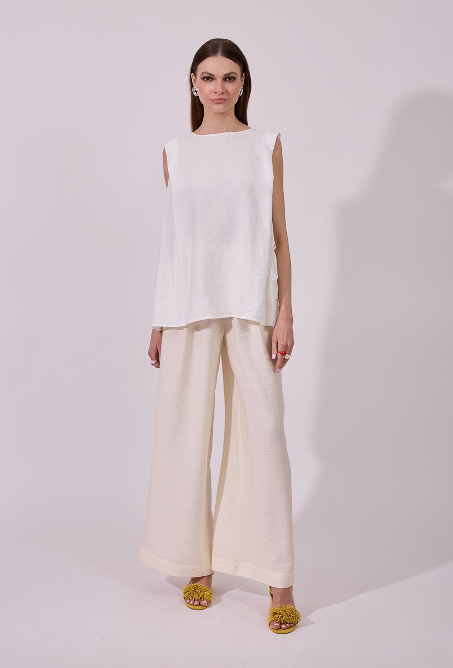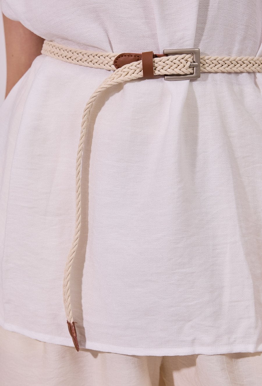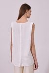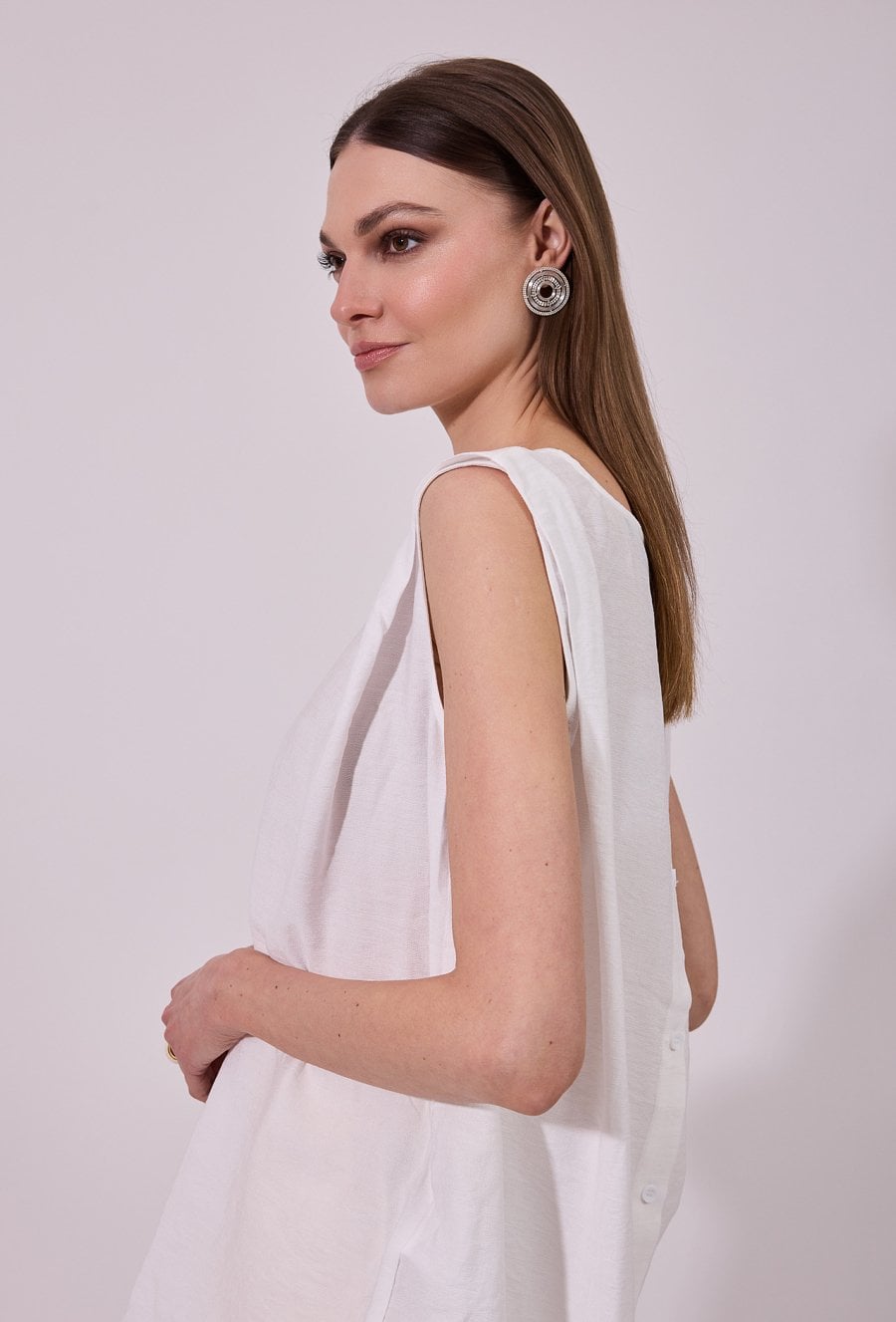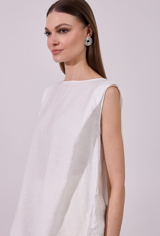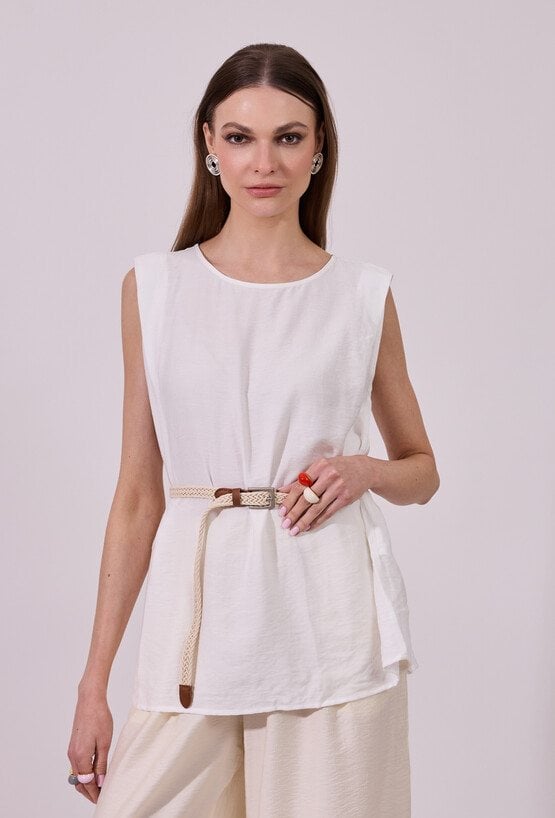 Bluzka damska o luźnym, lekko rozkloszowanym kroju bez rękawów. Model z klasycznym, okrągłym dekoltem, wzbogacony paskiem w talii, który podkreśla sylwetkę i nadaje całości kobiecego charakteru. Delikatne marszczenia dodają lekkości, a zapięcie na guziki z tyłu stanowi subtelny, stylowy detal. Doskonała propozycja zarówno do codziennych, jak i bardziej eleganckich stylizacji. Modelka na zdjęciu ma 177 cm wzrostu i prezentuje rozmiar 36.