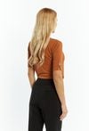 Bluzka damska z prążkowanej dzianiny. Model o swobodnym fasonie z dekoltem w serek oraz krótkim rękawem. Z pewnością sprawdzi się w niejednej stylizacji. Modelka prezentuje rozmiar S i mierzy 177 centymetrów wzrostu.