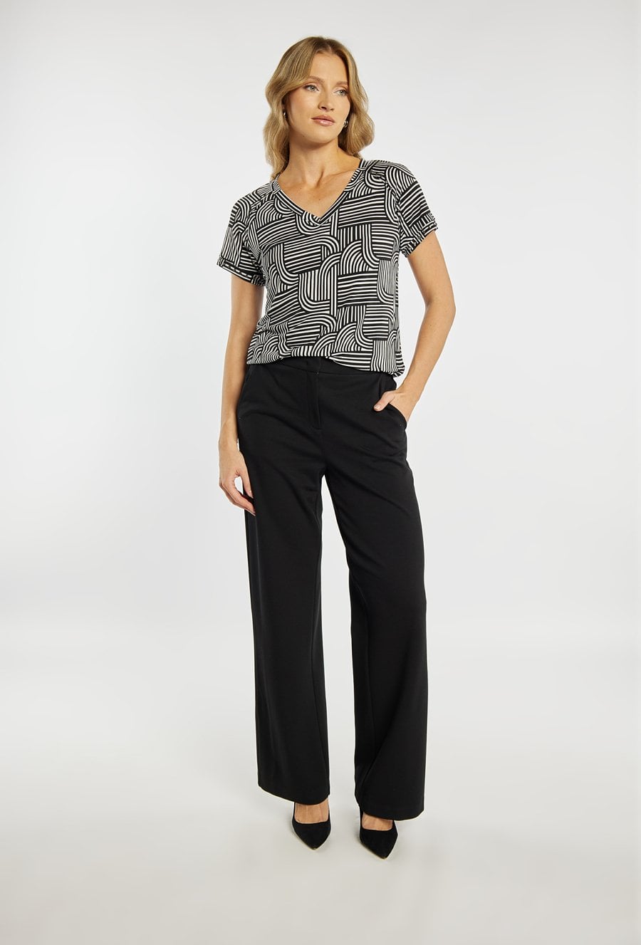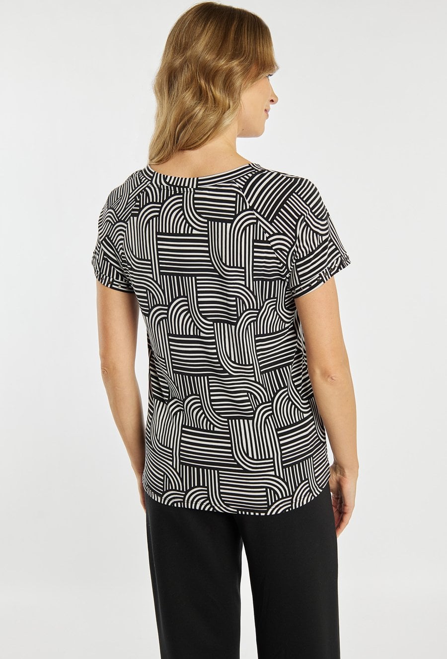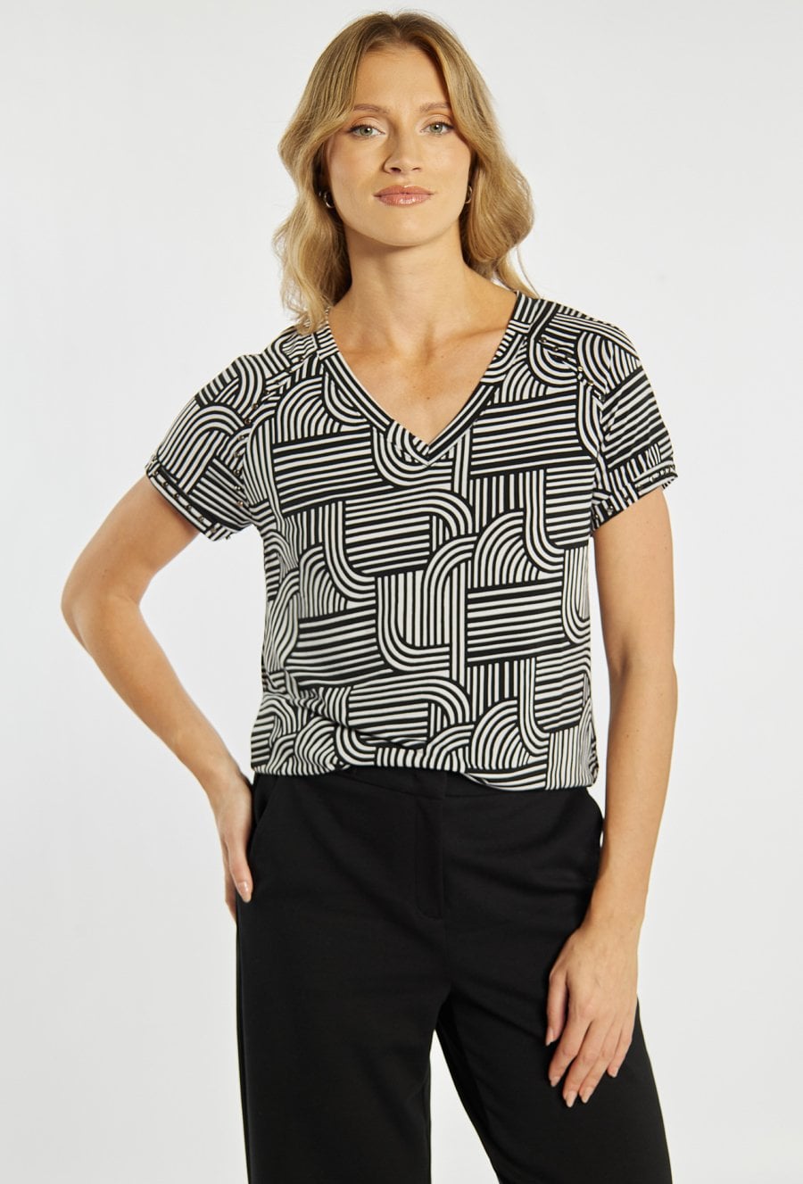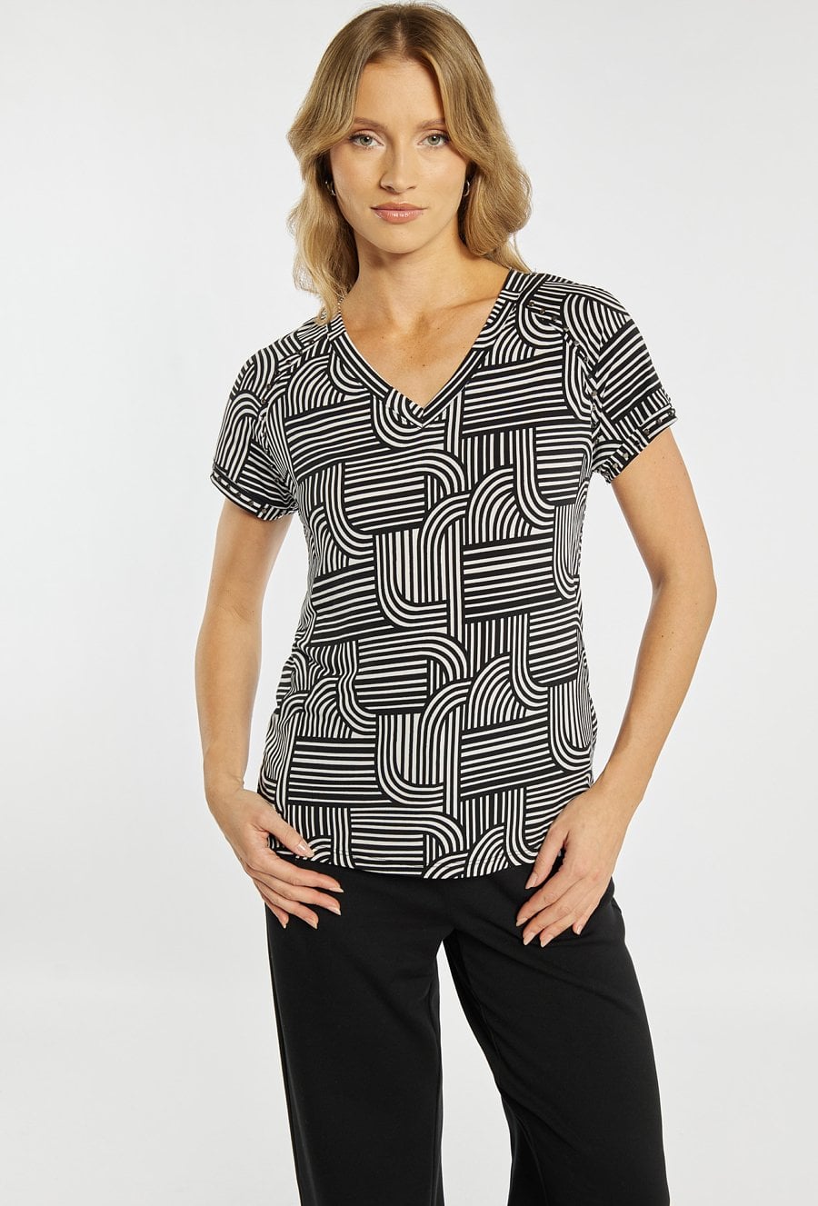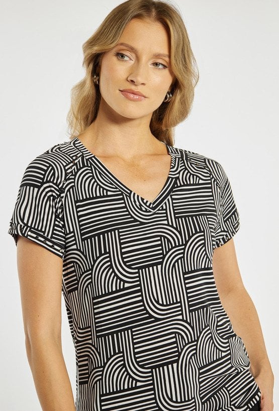 Bluzka damska o dopasowanym, komfortowym kroju. Model z krótkim rękawem oraz dekoltem w kształcie litery V, który subtelnie podkreśla linię szyi. Całość zdobi wyrazisty, geometryczny wzór, nadający stylizacji nowoczesnego charakteru. Modelka na zdjęciu ma 177 cm wzrostu i prezentuje rozmiar L.