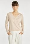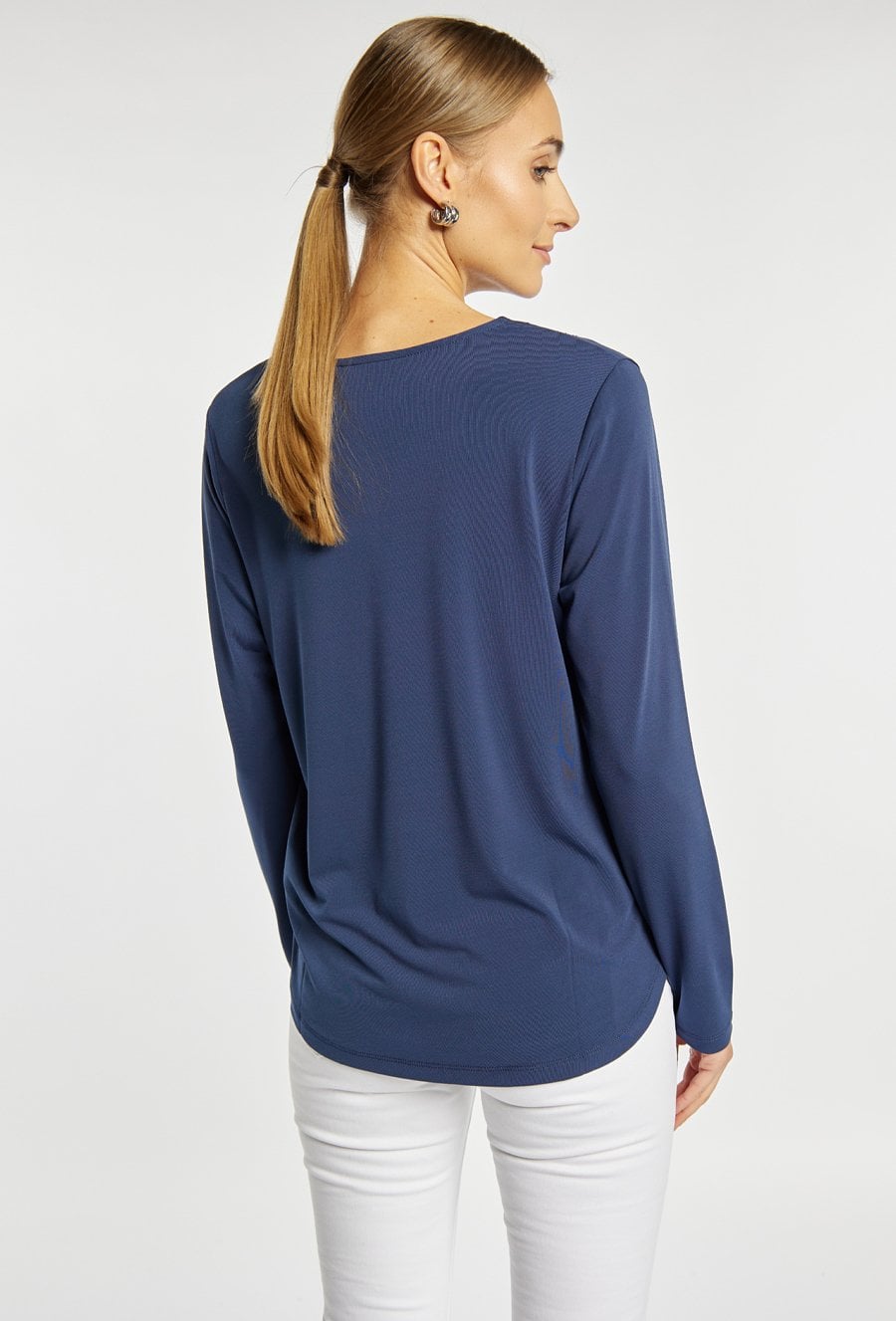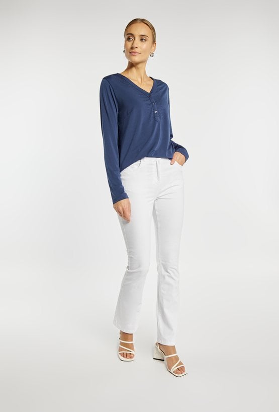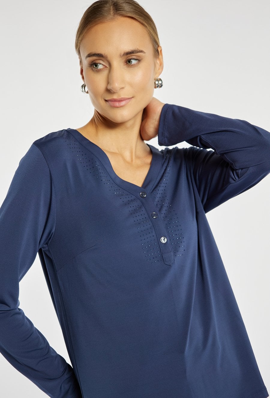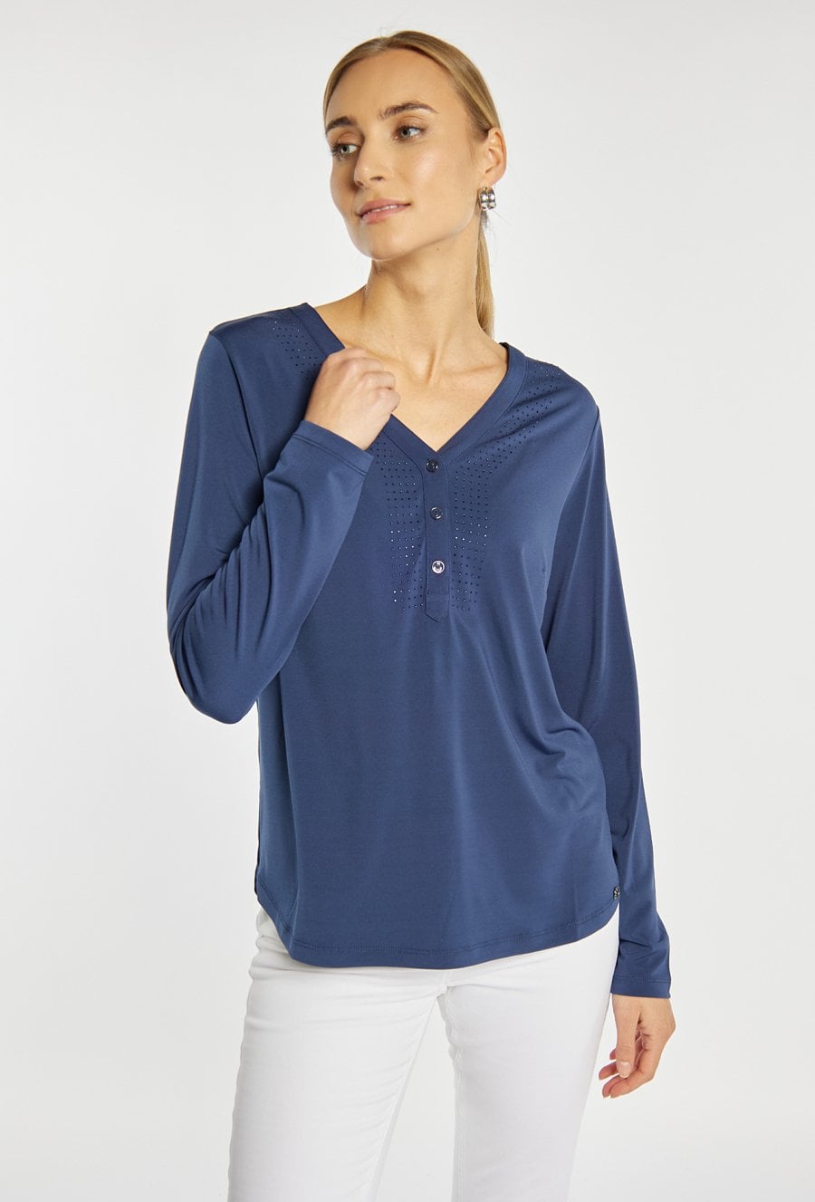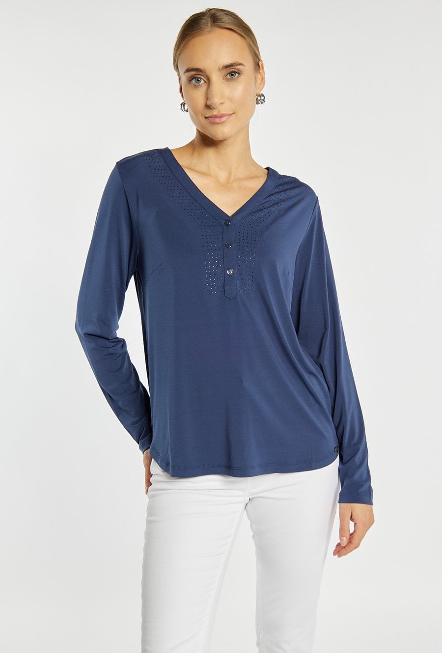 Bluzka z długimi rękawami i dekoltem w serek. Bluzka z subtelną listwą guzikową i delikatnymi zdobieniami przy dekolcie, idealna na co dzień oraz do elegantszych stylizacji. Modelka na zdjęciu ma 177 cm wzrostu i prezentuje rozmiar S.