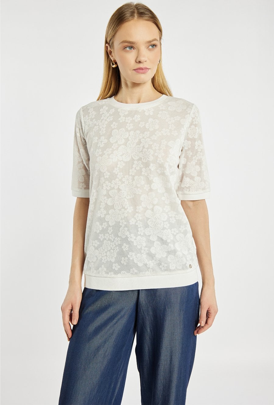 Bluzka damska o swobodnym fasonie w jasnym kolorze. Model z okrągłym dekoltem oraz rękawami o długości 3/4. Całość zdobi delikatny, kwiatowy wzór, który nadaje bluzce subtelnego i kobiecego charakteru. Modelka na zdjęciu ma 177 cm wzrostu i prezentuje rozmiar S.