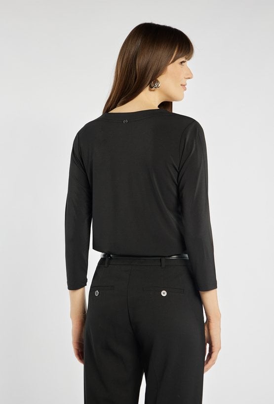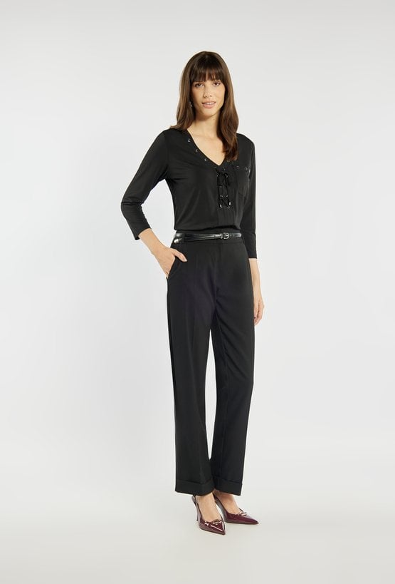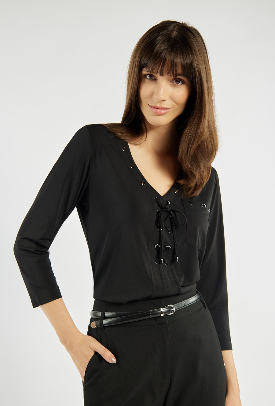 Bluzka z dekoltem w kształcie litery V ozdobionym efektownym sznurowaniem. Bluzka z rękawem 3/4. Subtelna kieszonka z przodu podkreśla casualowy, ale stylowy wygląd. Idealna do stylizacji zarówno dziennych, jak i wieczorowych.