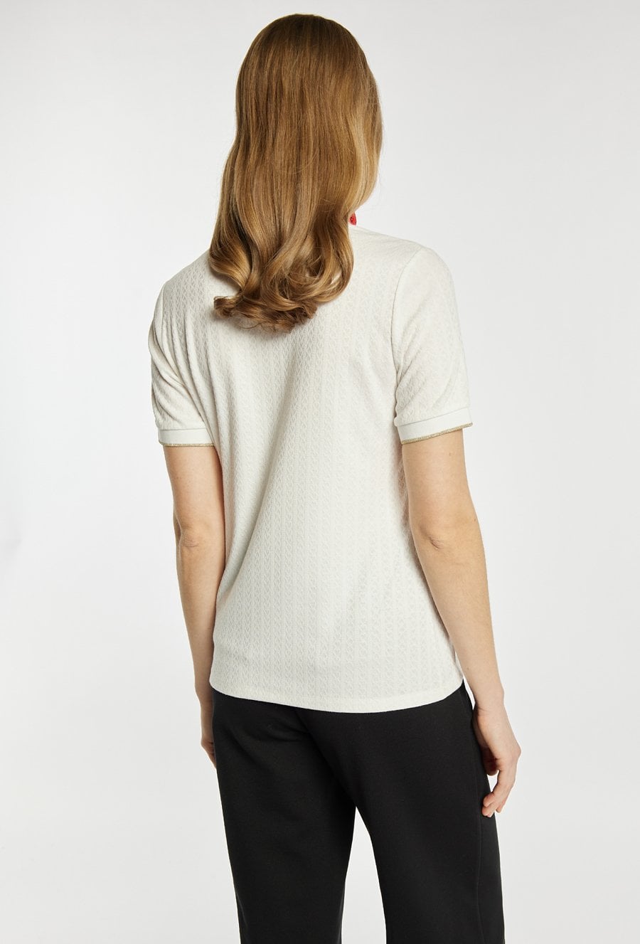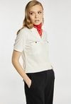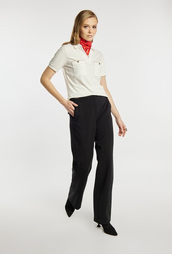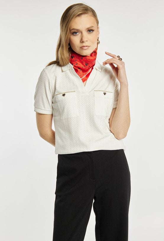 Bluzka z krótkim rękawem i kołnierzykiem wyróżnia się dwoma ozdobnymi kieszonkami na froncie, które dodają jej eleganckiego, lekko koszulowego charakteru. Model idealny do codziennych i bardziej klasycznych stylizacji. Modelka na zdjęciu ma 177 cm wzrostu i prezentuje rozmiar S.