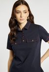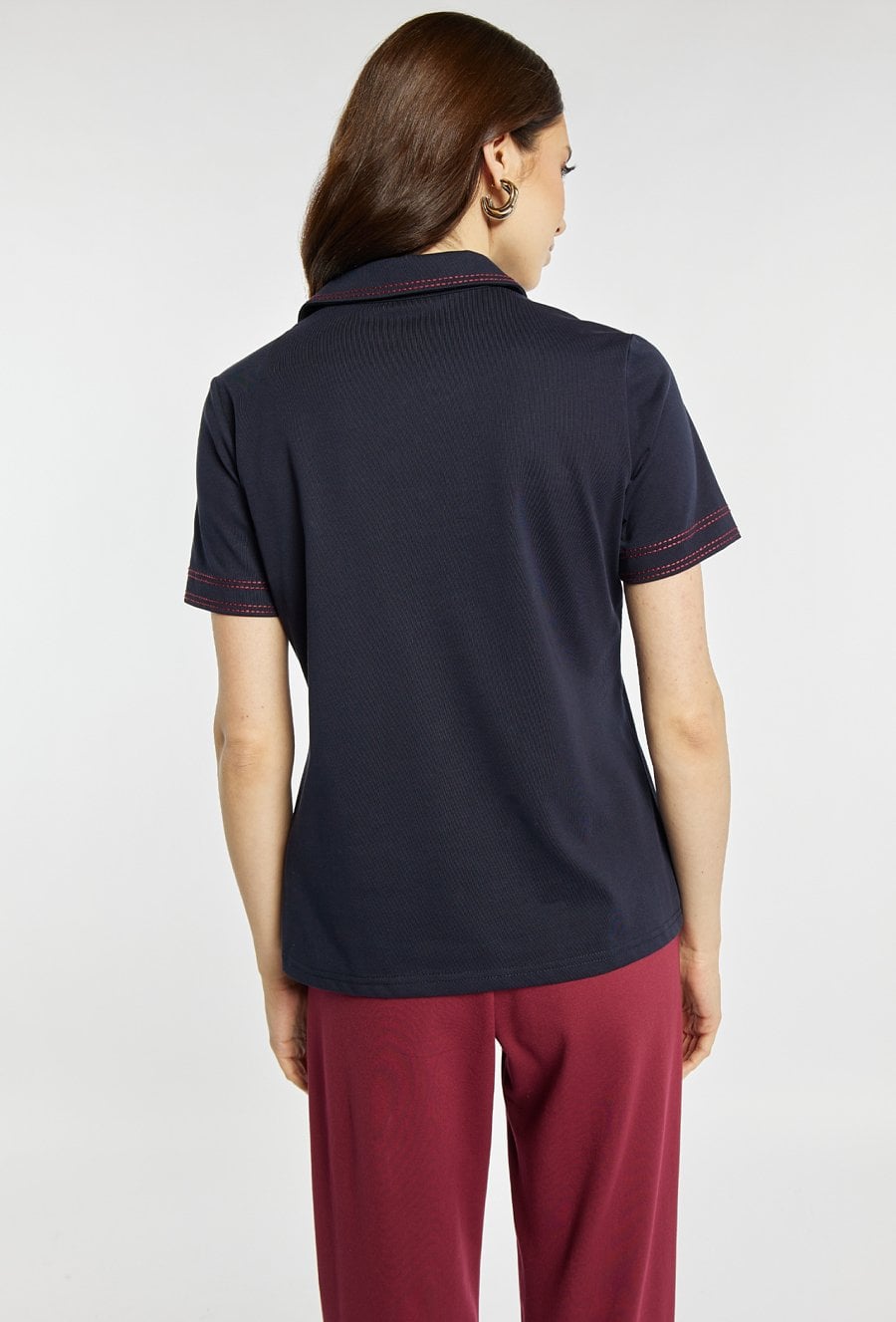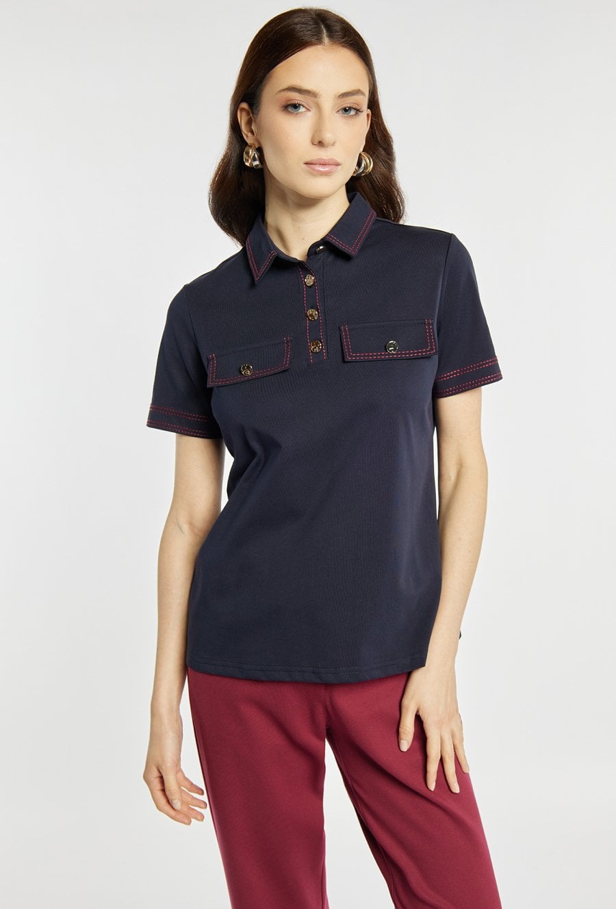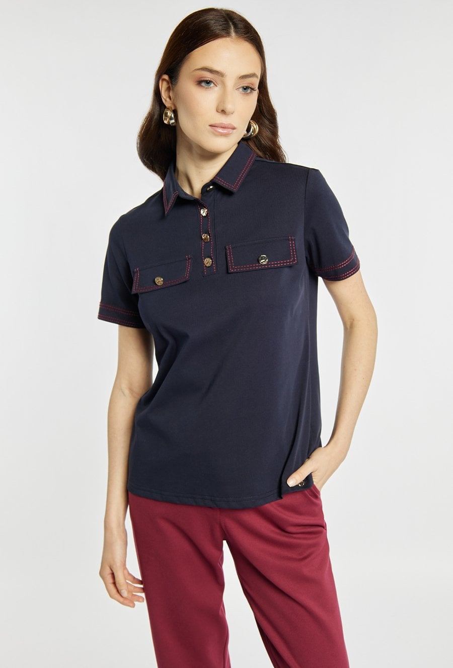 Bluzka o koszulowym charakterze, z krótkim rękawem i kołnierzykiem, wyróżnia się ozdobnymi kieszonkami na biuście. Subtelne przeszycia nadają jej dopracowanego, klasycznego wyglądu. Model idealny do codziennych i biznesowych stylizacji. Modelka na zdjęciu ma 177 cm wzrostu i prezentuje rozmiar S.