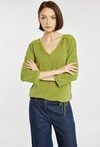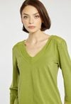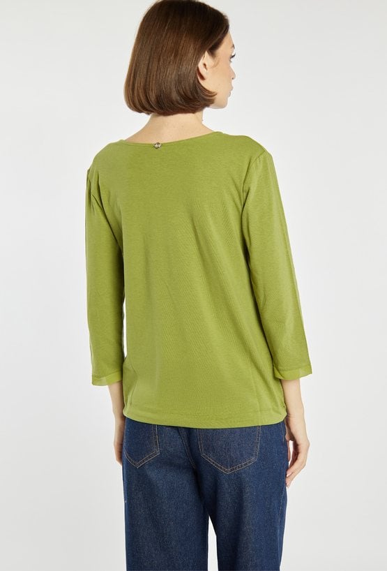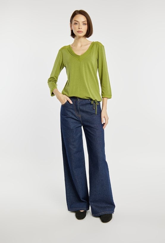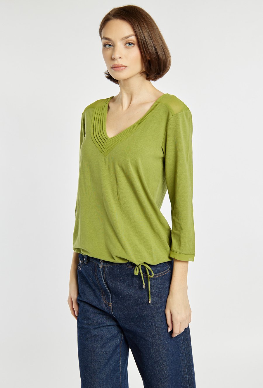 Bluzka z dekoltem w serek ozdobionym subtelnymi zakładkami, które dodają jej elegancji i lekkości. Bluzka o rękawach 3/4 i wiązaniu u dołu, dzięki któremu można dopasować fason do sylwetki. Idealna do codziennych stylizacji, jak i bardziej eleganckich zestawów. Modelka na zdjęciu ma 177 cm wzrostu i prezentuje rozmiar S.