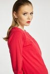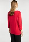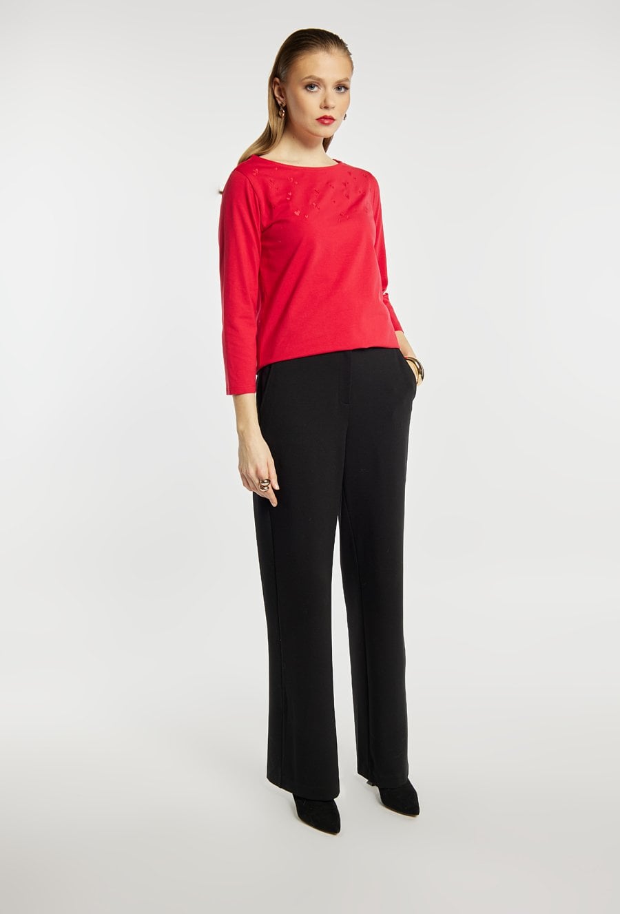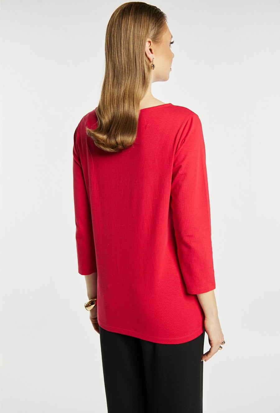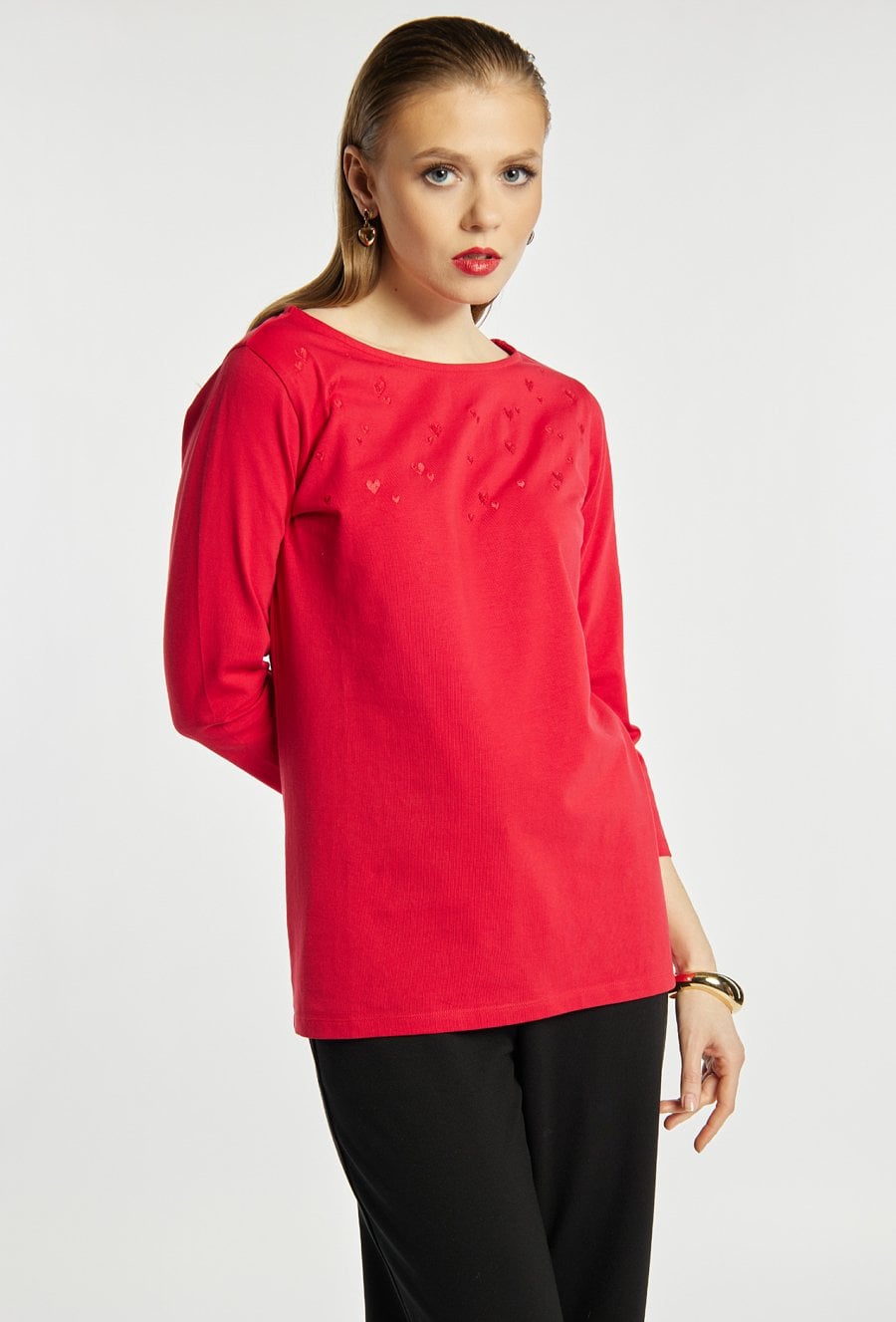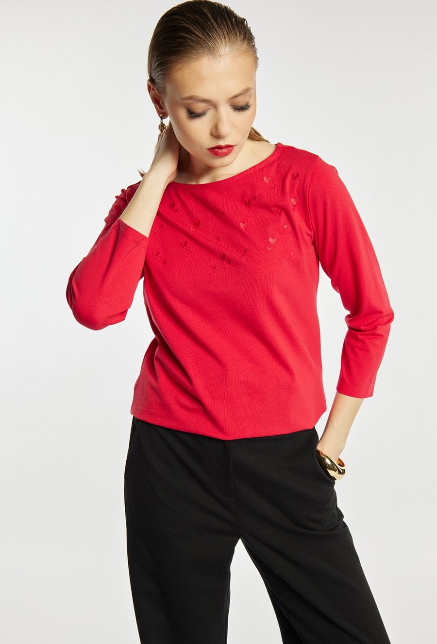 Bluzka z delikatnym, drobnym wzorem w serduszka umieszczonym w górnej części. Bluzka ma prosty fason, rękawy o długości 3/4 oraz klasyczny, zaokrąglony dekolt. Bluzka sprawdzi się na co dzień, dodając subtelny, kobiecy akcent do stylizacji. Modelka na zdjęciu ma 177 cm wzrostu i prezentuje rozmiar S.