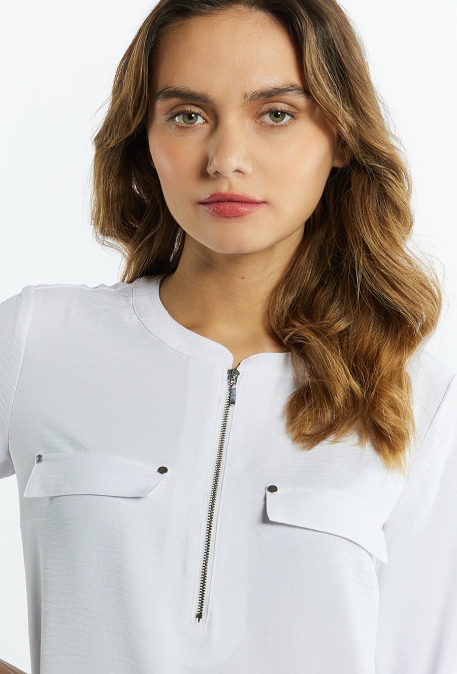 Koszulowa bluzka damska ze stójką przy dekolcie. Koszula z długimi rękawami z możliwością podwinięcia oraz ozdobnymi patkami. Model ten sprawdzi się w niejednej stylizacji. Modelka na zdjęciu ma 177 cm wzrostu i prezentuje rozmiar 36,