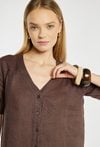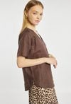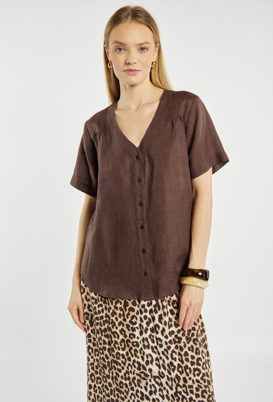 Bluzka damska o swobodnym, naturalnym fasonie. Bluzka z dekoltem w serek, zapinany na guziki, z krótkimi rękawami. Prosty krój i miękka tkanina zapewniają komfort noszenia, a klasyczna forma sprawia, że bluzka doskonale sprawdzi się w codziennych stylizacjach. Modelka na zdjęciu ma 177 cm wzrostu i prezentuje rozmiar 36.