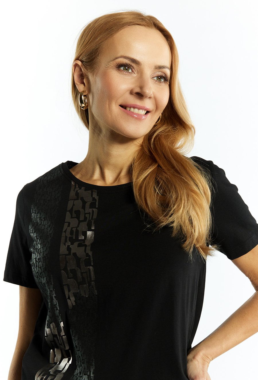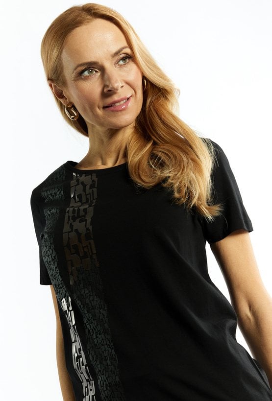 T-shirt damski wykonany z przyjemnej bawełny. T-shirt z krótkim rękawem, półokrągłym dekoltem oraz zdobieniem na przednim panelu. Model ten świetnie dopełni wiosenne stylizację. Modelka na zdjęciu ma 177 cm wzrostu i prezentuje rozmiar S.