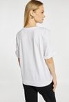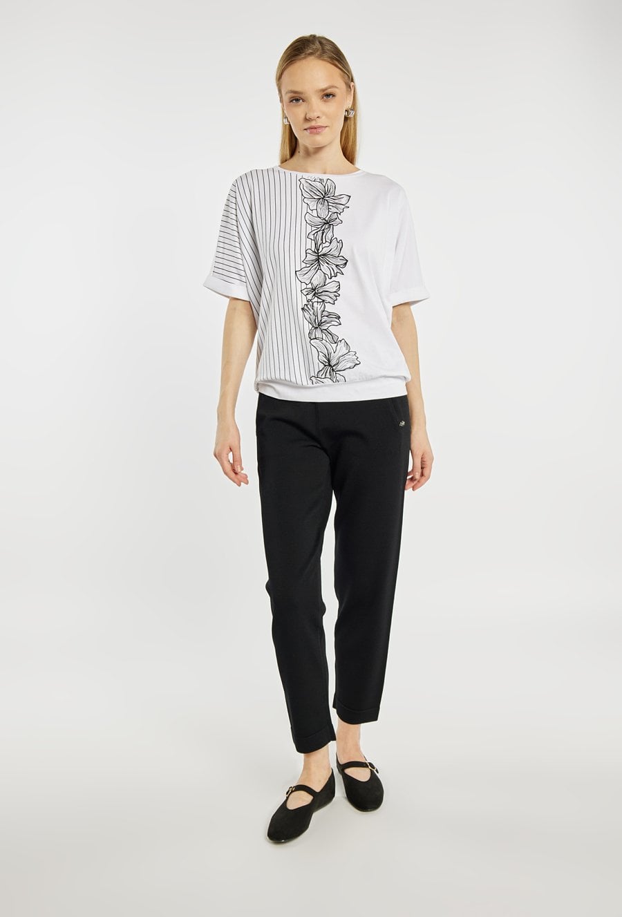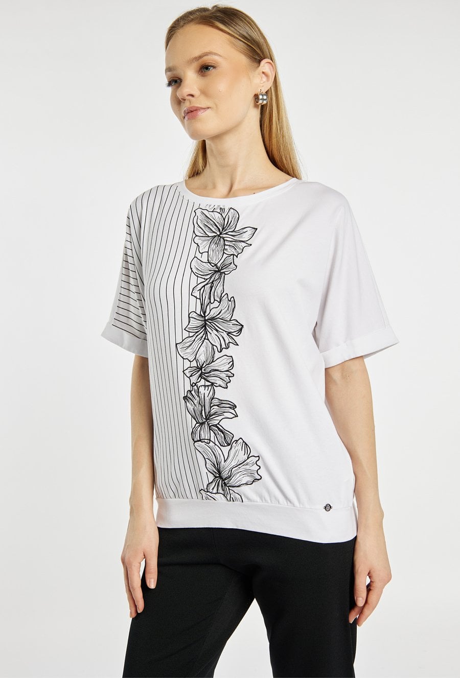 T-shirt damski o luźnym fasonie. Model z okrągłym dekoltem oraz krótkimi rękawami. Z przodu ozdobiony efektownym, pionowym motywem kwiatowym połączonym z delikatnymi paskami, który nadaje całości eleganckiego i nowoczesnego charakteru. Idealny do codziennych i półeleganckich stylizacji. Modelka na zdjęciu ma 177 cm wzrostu i prezentuje rozmiar S.