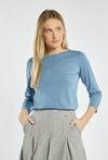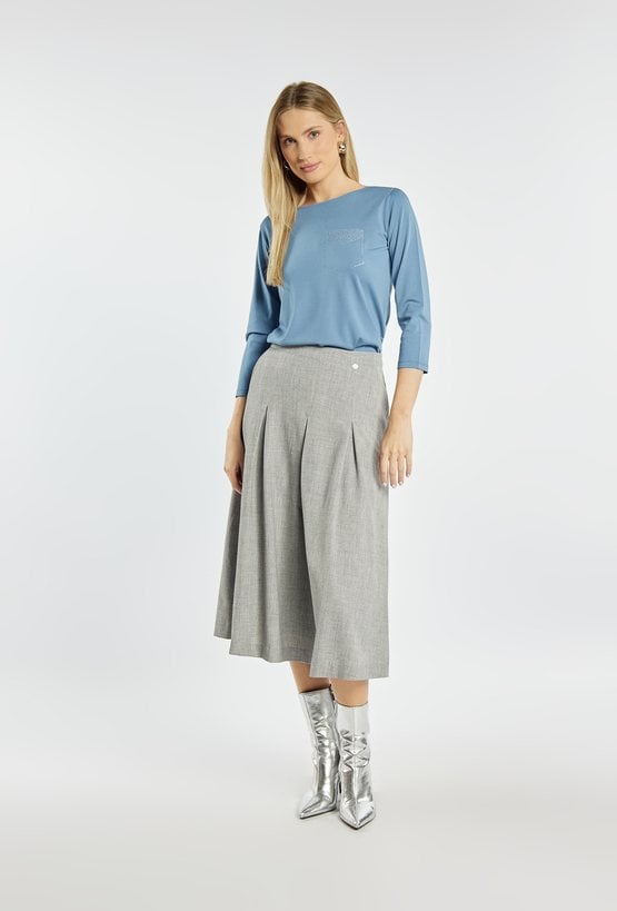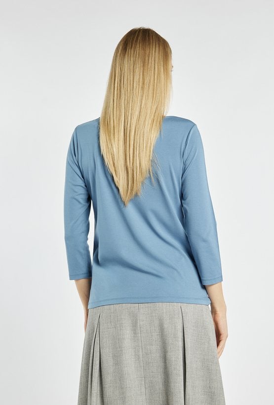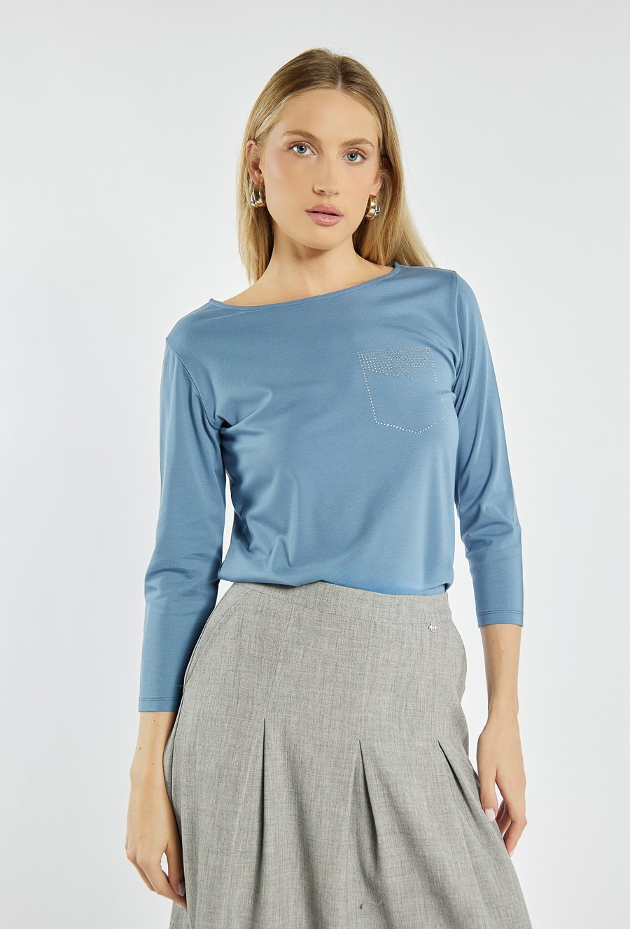 T-shirt z rękawem 3/4, wykonany z lekkiego, gładkiego materiału. Zdobiony aplikacją w formie subtelnej kieszonki z drobnych cyrkonii, co nadaje mu eleganckiego charakteru. Prosty fason sprawia, że świetnie pasuje zarówno do spódnicy, jak i spodni. Modelka na zdjęciu ma 177 cm wzrostu i prezentuje rozmiar S