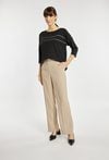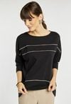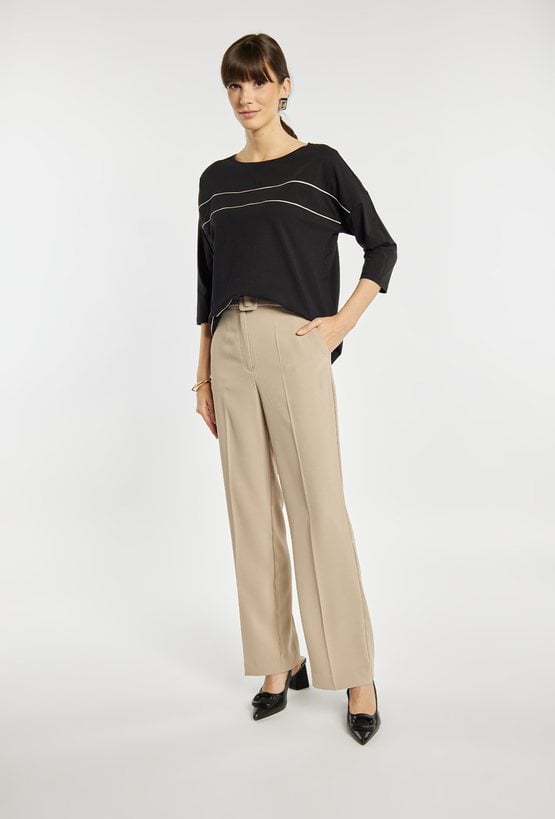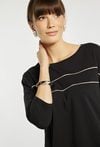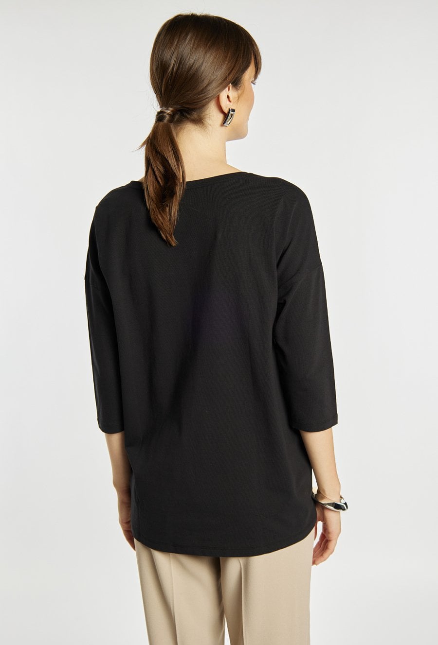 T-shirt z rękawem 3/4 i półokrągłym dekoltem to wygodny, codzienny model z delikatnymi, kontrastowymi przeszyciami z przodu. T-shirt ma luźny fason, miękki materiał i świetnie sprawdzi się w casualowych stylizacjach. Modelka na zdjęciu ma 177 cm wzrostu i prezentuje rozmiar S.