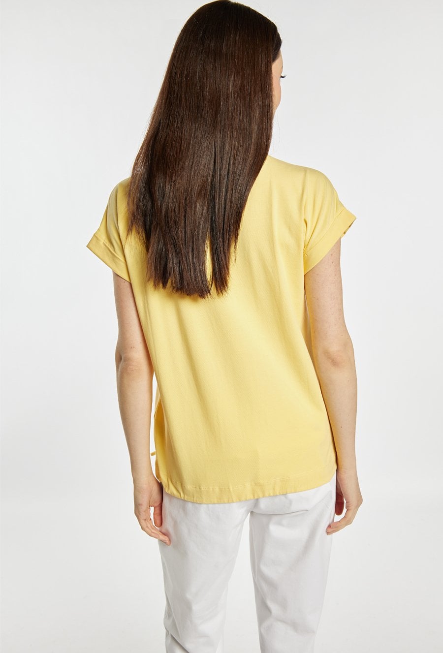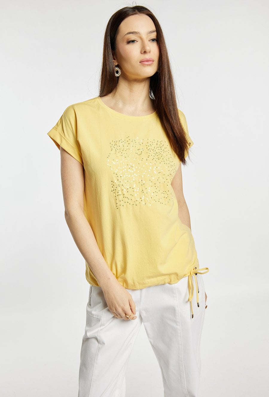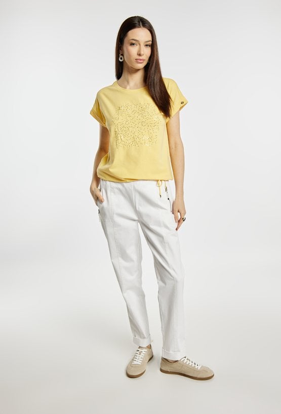 T-shirt damski o swobodnym fasonie. Model z okrągłym dekoltem oraz krótkimi rękawami z podwinięciem. Z przodu ozdobiony subtelnym, dekoracyjnym nadrukiem z delikatnym połyskiem, który nadaje całości eleganckiego charakteru. Modelka na zdjęciu ma 177 cm wzrostu i prezentuje rozmiar S