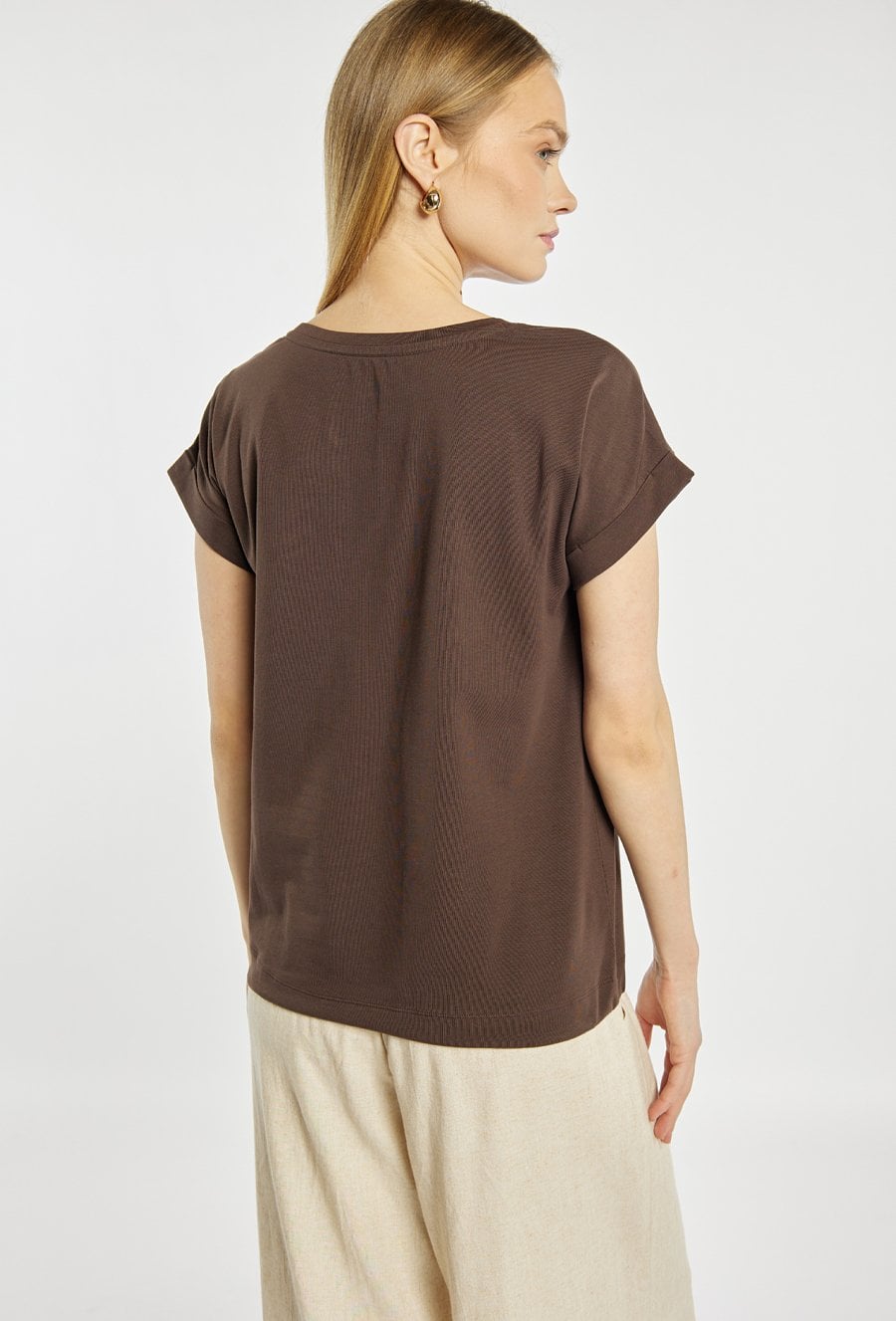 T-shirt damski o swobodnym fasonie. Model z okrągłym dekoltem oraz krótkimi rękawami z podwinięciem. Z przodu ozdobiony subtelnym, dekoracyjnym nadrukiem z delikatnym połyskiem, który nadaje całości eleganckiego charakteru. Modelka na zdjęciu ma 177 cm wzrostu i prezentuje rozmiar S