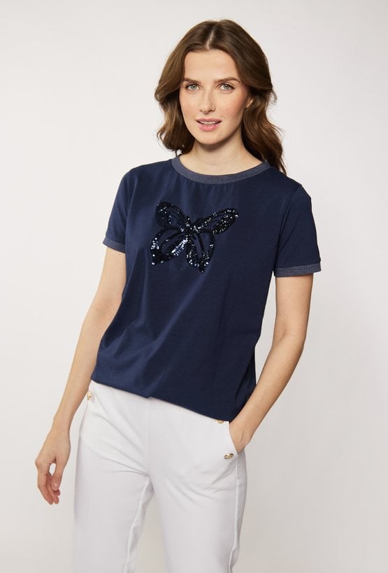 T-shirt damski z cekinowym motylem, wykonany z bawełny. T-shirt z krótkimi rękawami, półokrągłym dekoltem oraz wiązaniem u dołu. Model ten z pewnością sprawdzi się jako baza do codziennych stylizacji. Modelka na zdjęciu ma 177 cm wzrostu i prezentuje rozmiar 36.