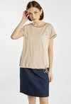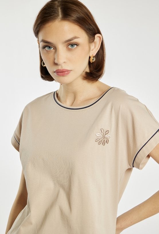T-shirt damski o prostym, lekko swobodnym kroju. Model z krótkim rękawem i okrągłym dekoltem. a przodzie znajduje się delikatny, haftowany wzór w formie kwiatu, stanowiący dyskretny akcent ozdobny. Dół koszulki z regulowanym wiązaniem pozwala dopasować fason do sylwetki. T-shirt dobrze sprawdzi się w codziennych stylizacjach.