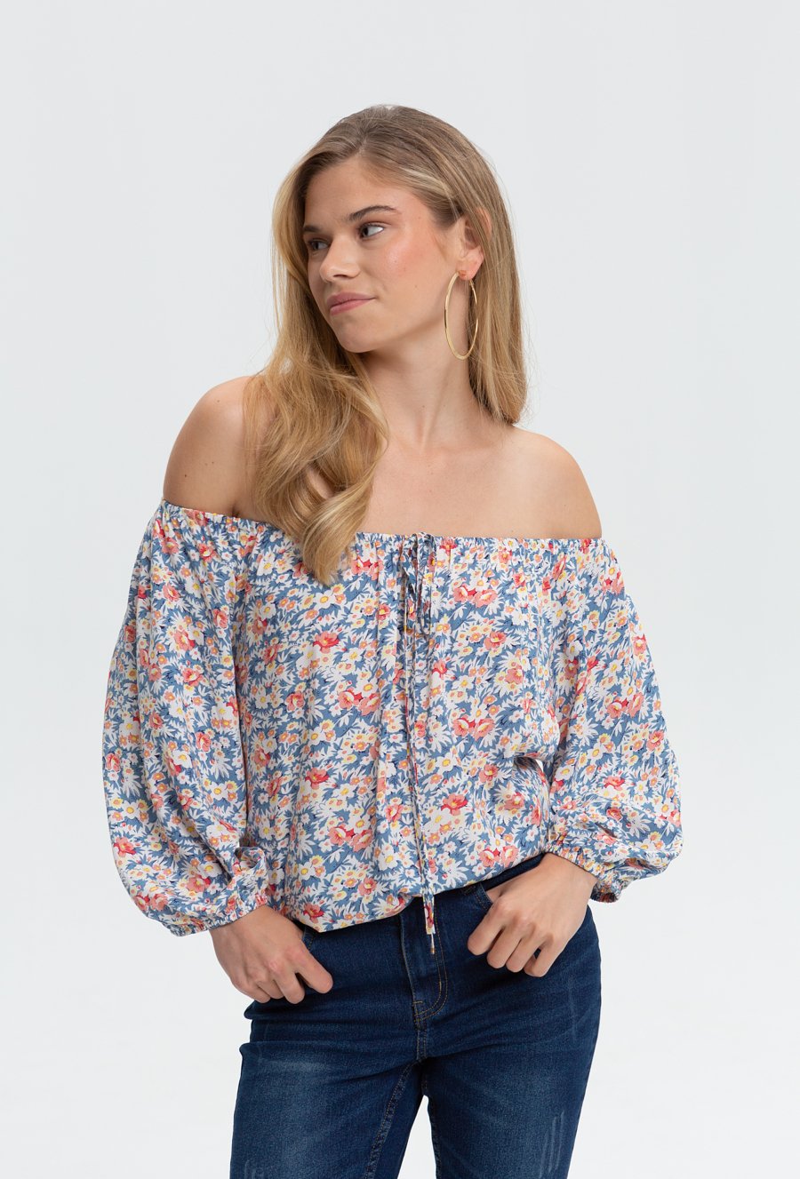 Wielobarwna bluzka damska typu hiszpanka wykonana z miękkiej, wiskozowej tkaniny. Bluzka z głębokim dekoltem z wiązaniem oraz długimi rękawami. Model ten z pewnością sprawdzi się w letnie dni. Modelka na zdjęciu ma 174 cm wzrostu i prezentuje rozmiar 36.