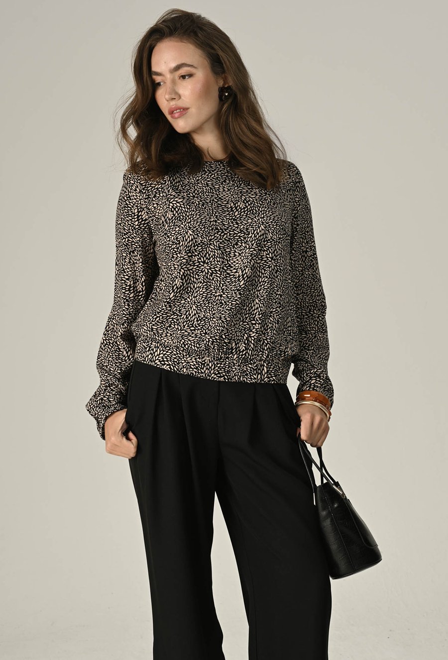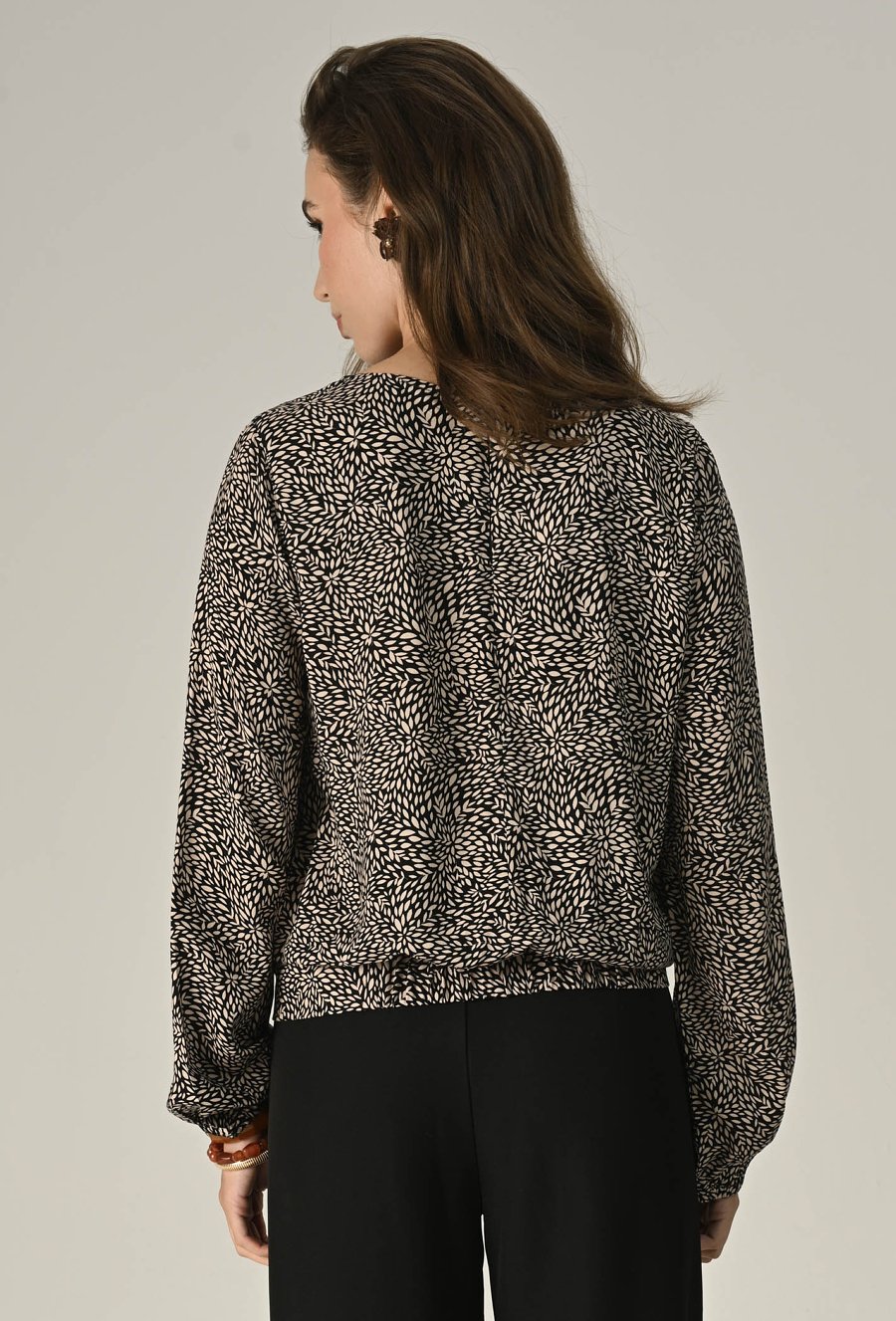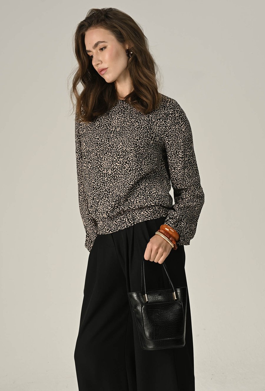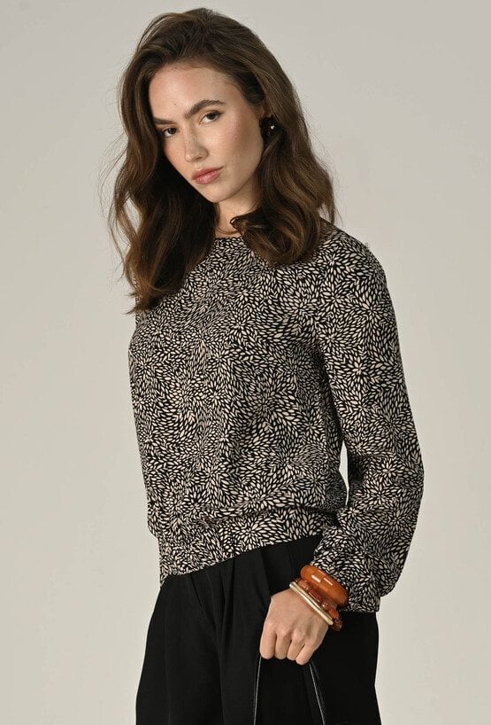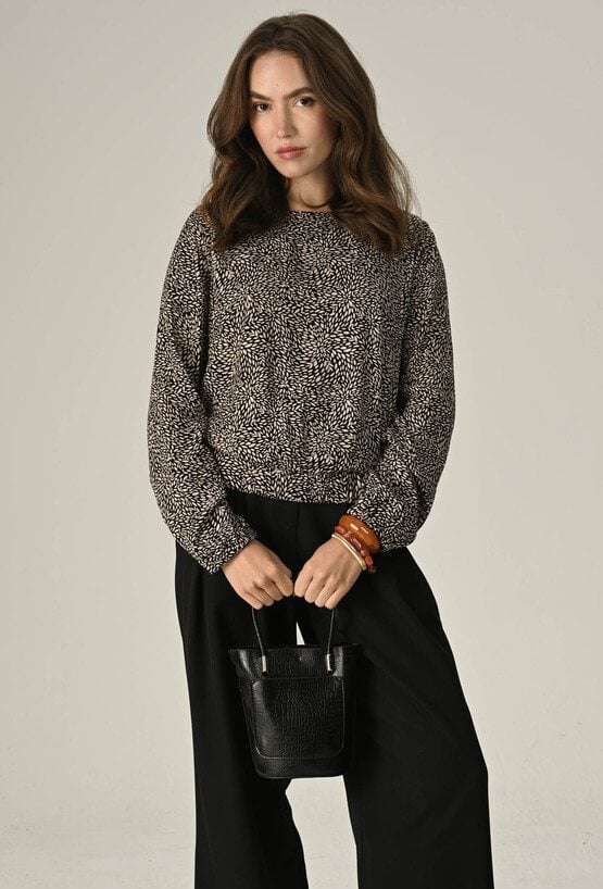 Lekka i kobieca bluzka z przyjemnej w dotyku wiskozy to idealna propozycja na co dzień i specjalne okazje. Fason zakończony gumką delikatnie podkreśla sylwetkę, a długie rękawy z elastycznym wykończeniem dodają swobody i uroku. Zamek z tyłu ułatwia zakładanie i stanowi subtelny detal. Świetnie sprawdzi się w zestawie z jeansami, spódnicą czy eleganckimi spodniami. Modelka na zdjęciu ma 177 cm wzrostu i prezentuje rozmiar 36.