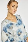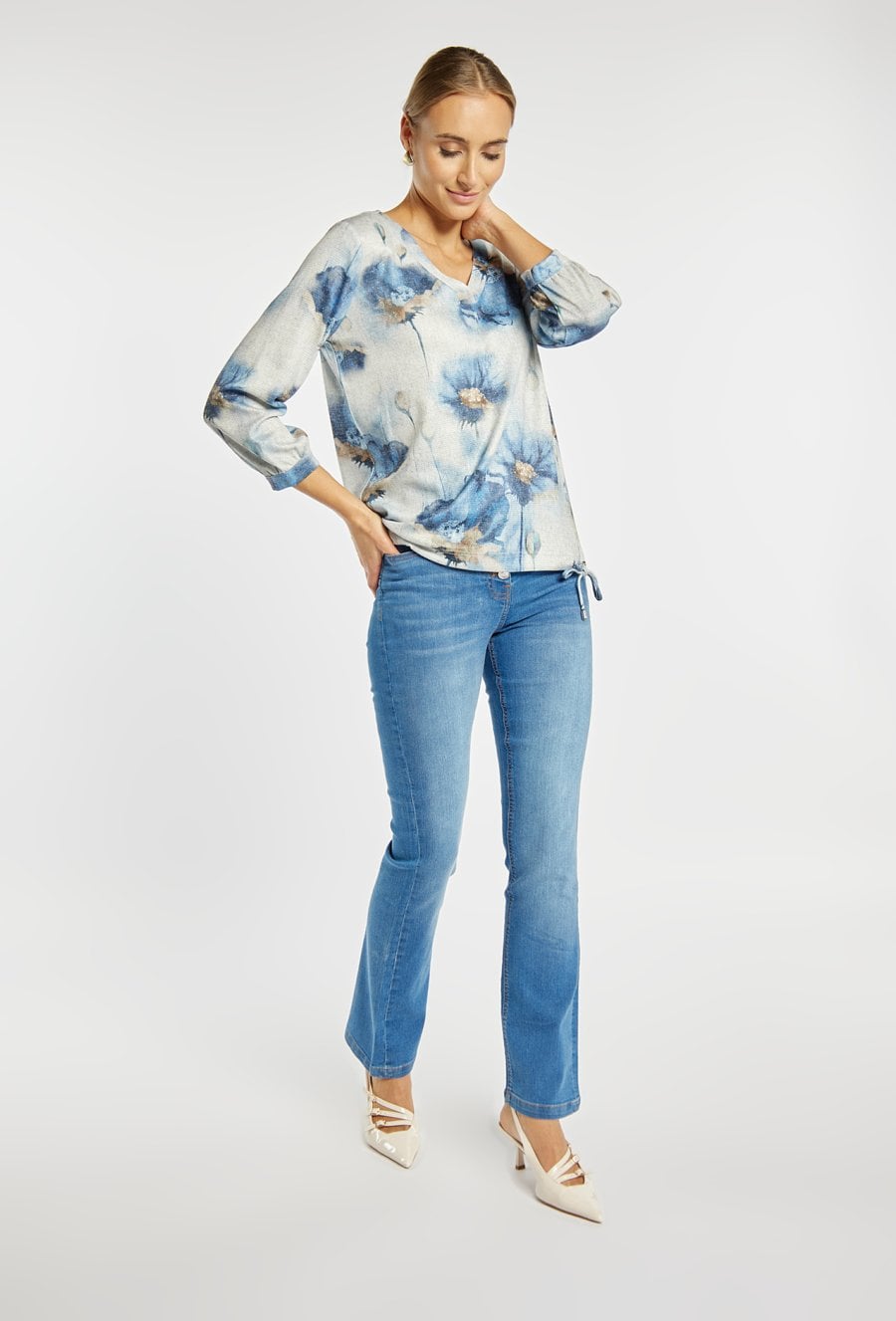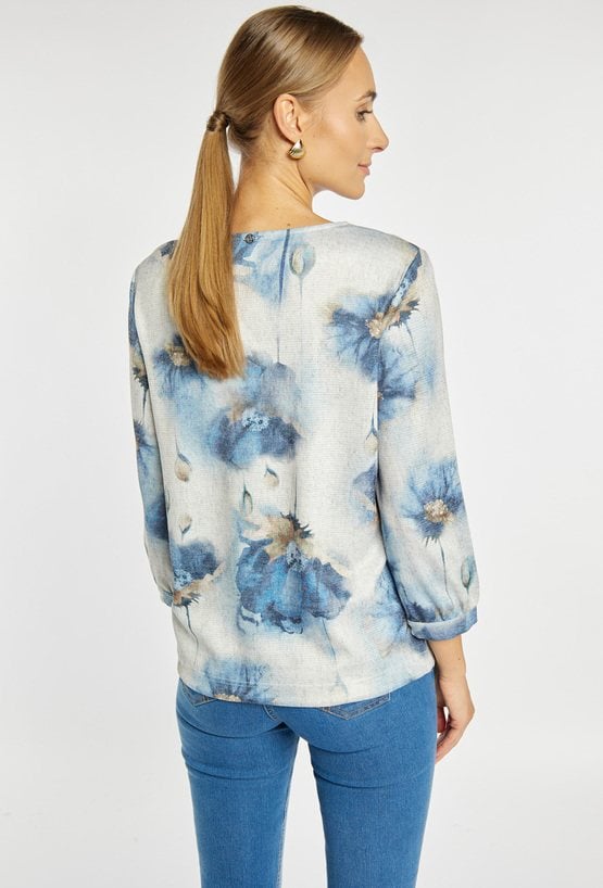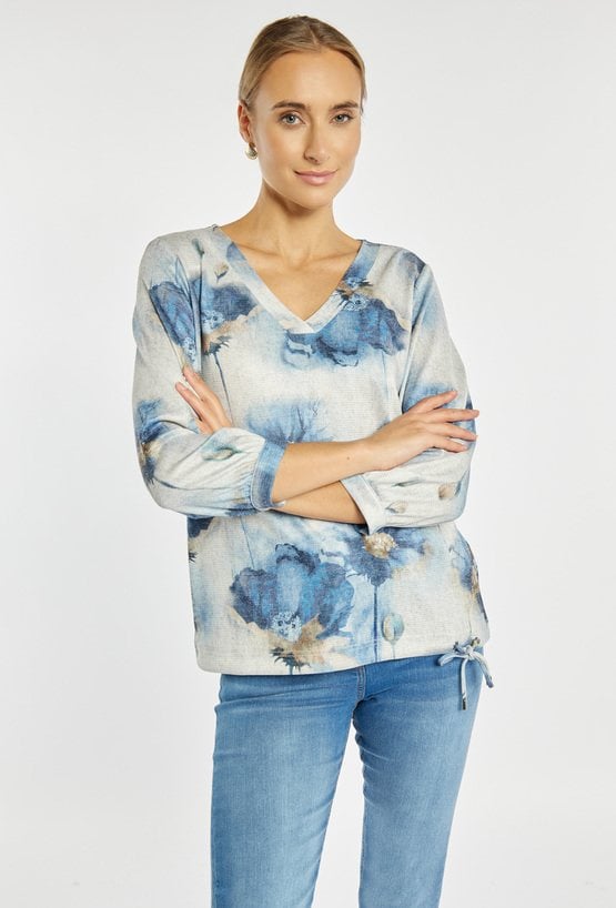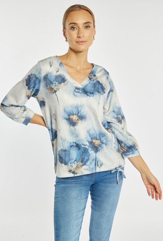 Bluzka o swobodnym kroju z efektownym, akwarelowym motywem kwiatowym. Dekolt w kształcie V delikatnie wysmukla sylwetkę, a rękawy 3/4 dodają lekkości. Model wykończony na dole troczkiem, który pozwala subtelnie regulować szerokość i dopasować fason do własnych preferencji. Idealna do jeansów i codziennych, wiosennych stylizacji. Modelka na zdjęciu ma 177 cm wzrostu i prezentuje rozmiar S.