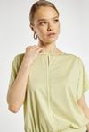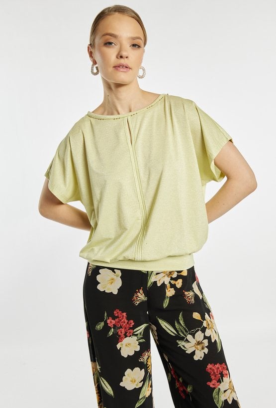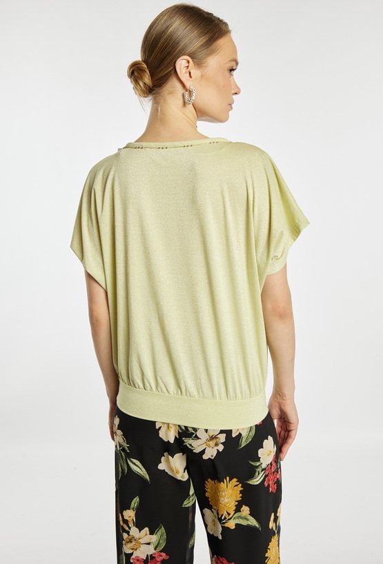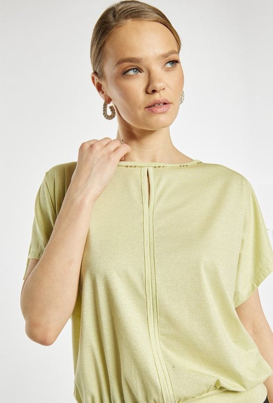 Bluzka damska o luźnym, swobodnym kroju. Model z krótkim, szerokim rękawem oraz półokrągłym dekoltem wykończonym subtelną lamówką. Dół zakończony elastycznym ściągaczem, który zapewnia dobre dopasowanie i podkreśla sylwetkę. Modelka na zdjęciu ma 177 cm wzrostu i prezentuje rozmiar S.