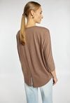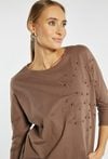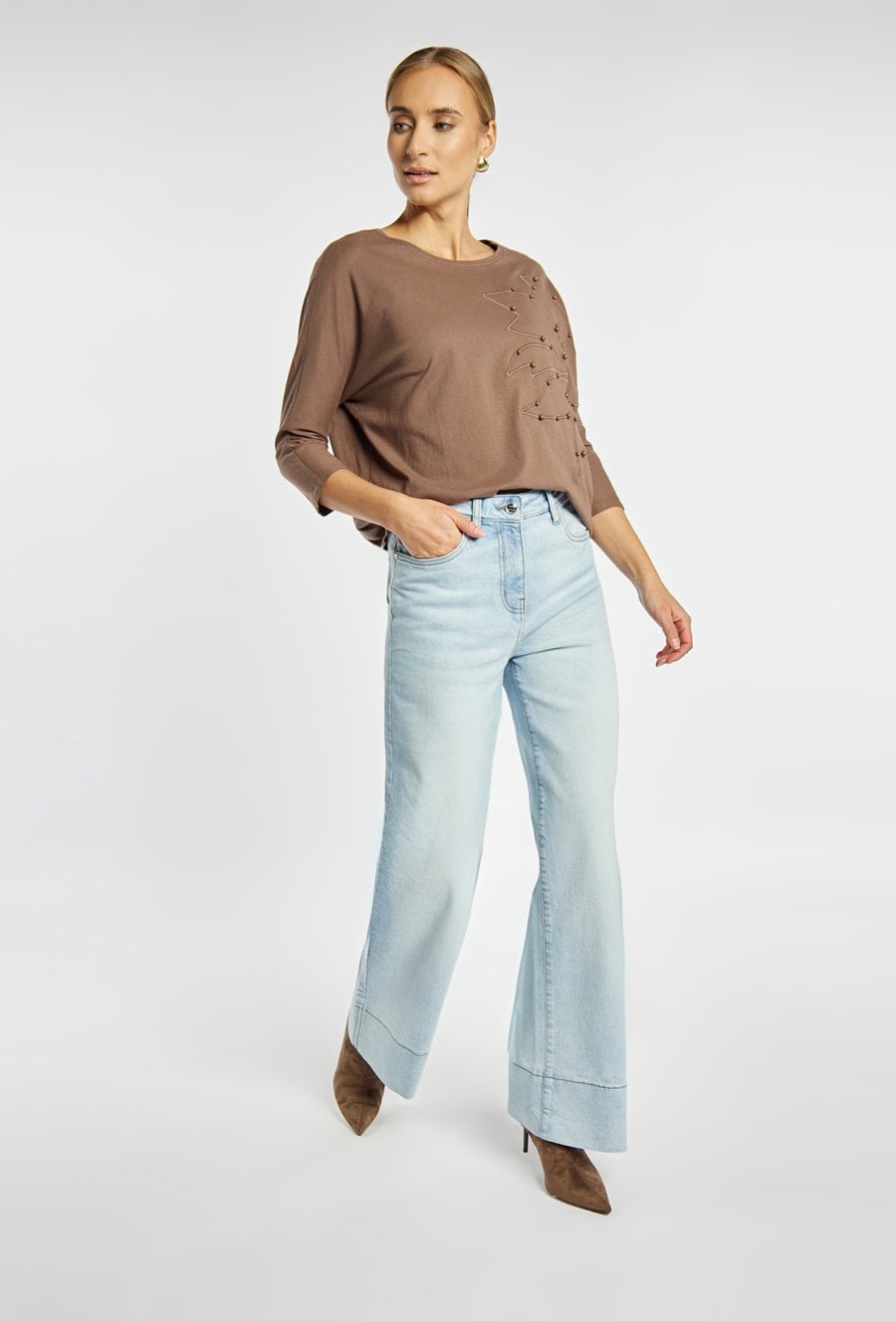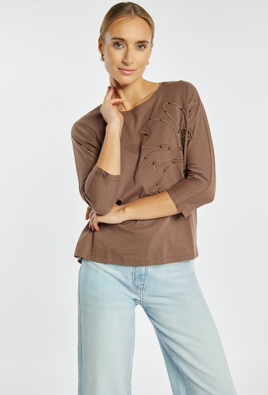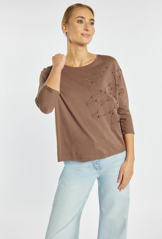 Bluzka z rękawem 3/4 ozdobiona przestrzenną aplikacją z koralikami, która nadaje całości oryginalnego charakteru. Luźniejszy krój zapewnia komfort, a miękka dzianina świetnie układa się na sylwetce. Idealna na co dzień. Modelka na zdjęciu ma 177 cm wzrostu i prezentuje rozmiar S.