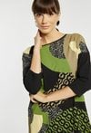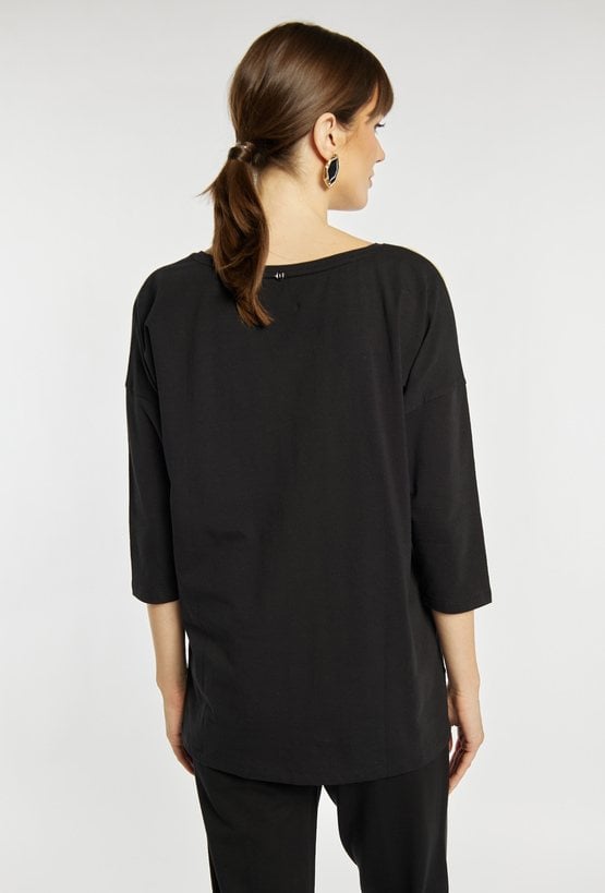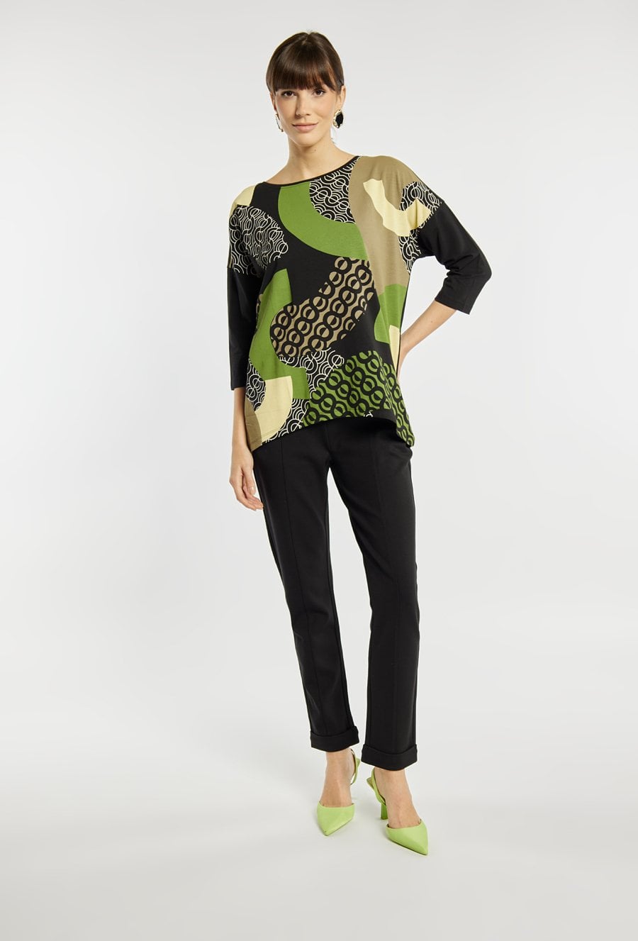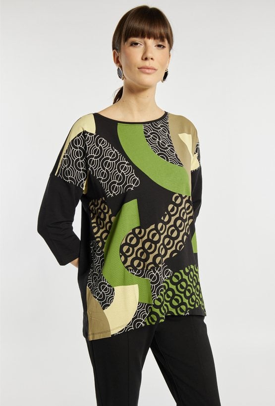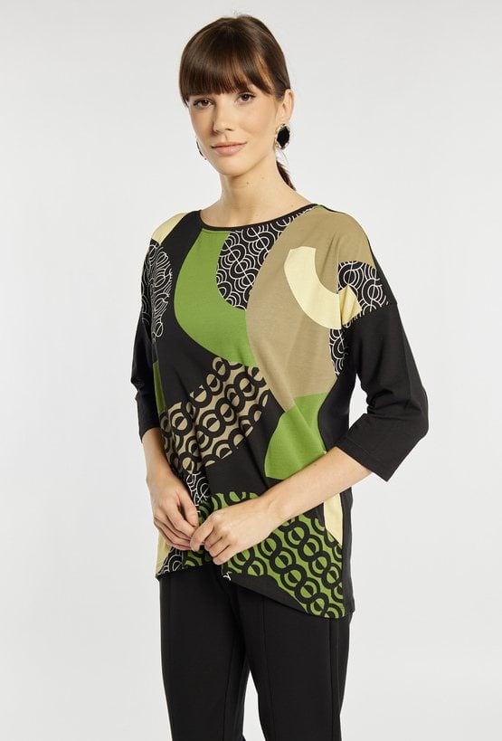 Bluzka damska o swobodnym kroju z wyrazistym, geometrycznym wzorem. Bluzka ma okrągły dekolt oraz rękawy o długości 3/4, które zapewniają wygodę na co dzień. Bluzka świetnie urozmaici stylizacje, dodając im nowoczesnego charakteru. Modelka na zdjęciu ma 177 cm wzrostu i prezentuje rozmiar S.