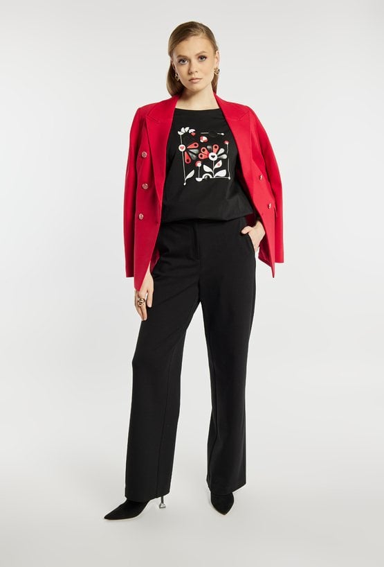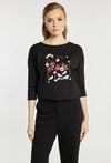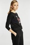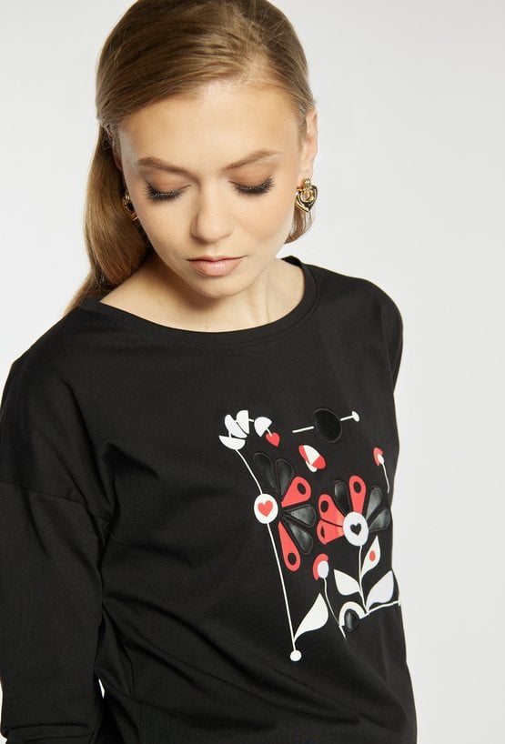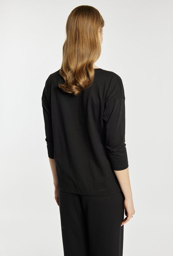 Bluzka damska z rękawem 3/4 i półokrągłym dekoltem wyróżnia się artystycznym nadrukiem w kontrastowych kolorach, który dodaje stylizacji nowoczesnego charakteru. Model idealny na co dzień i do casualowych zestawów.