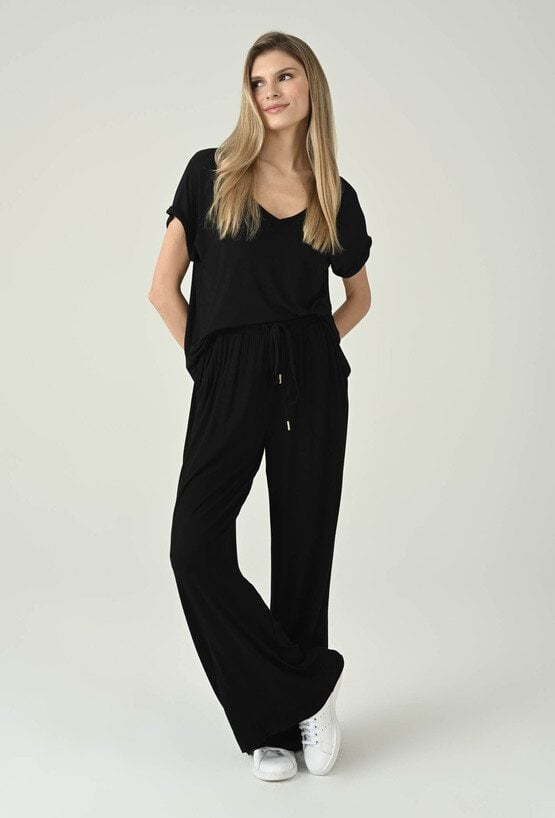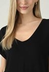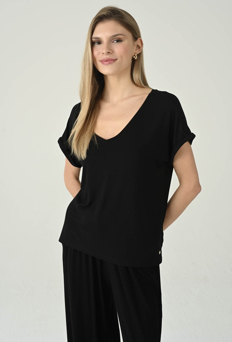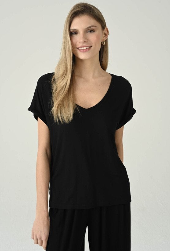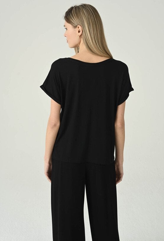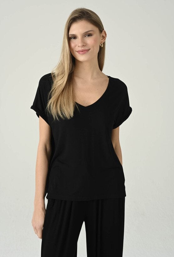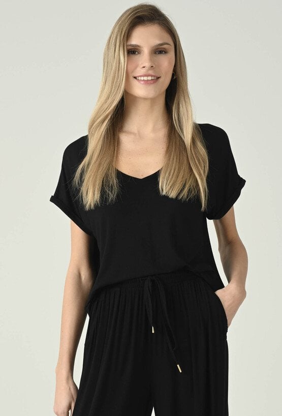 Uniwersalna czarna bluzka o swobodnym fasonie, która łączy minimalistyczny styl z komfortem noszenia. Dekolt w kształcie litery V subtelnie podkreśla szyję i dodaje kobiecej lekkości, a krótkie rękawy z podwinięciem nadają całości nowoczesnego, casualowego charakteru. Luźniejszy krój zapewnia swobodę ruchów i świetnie układa się na sylwetce, dzięki czemu model sprawdzi się w wielu zestawach na co dzień. Bluzka doskonale wygląda zarówno w komplecie z pasującymi spodniami, jak i w połączeniu z jeansami, spodniami materiałowymi czy spódnicą — to baza, po którą będziesz sięgać regularnie.