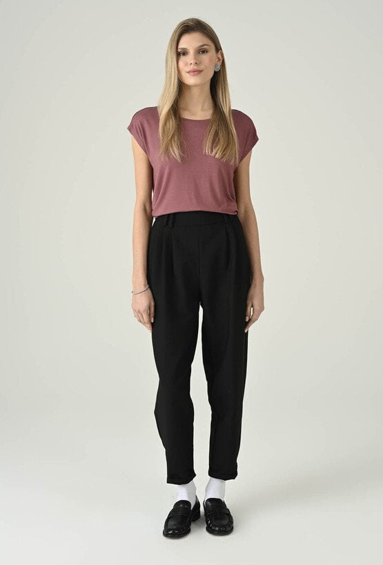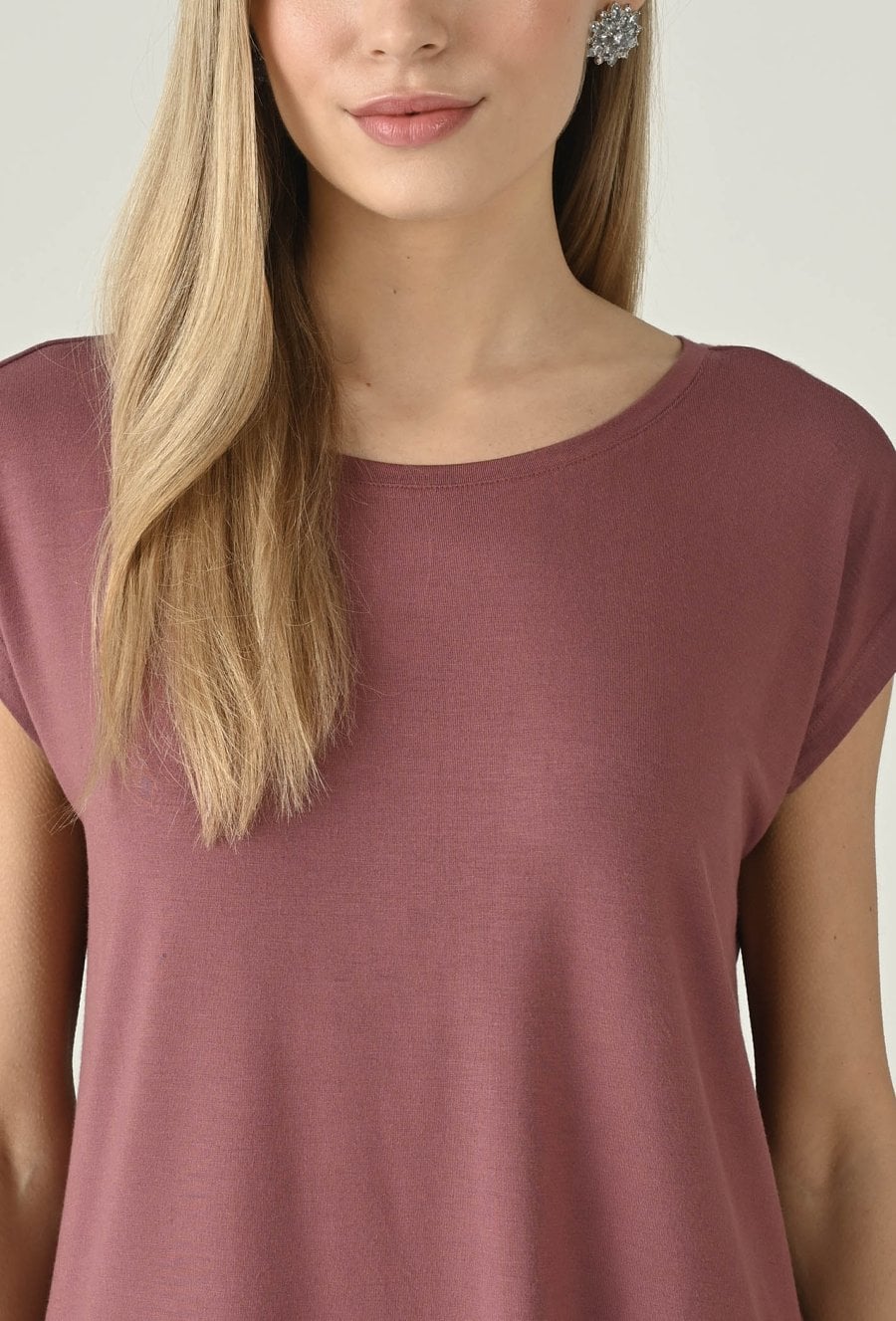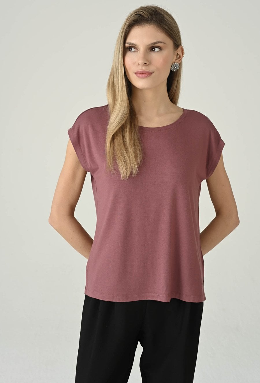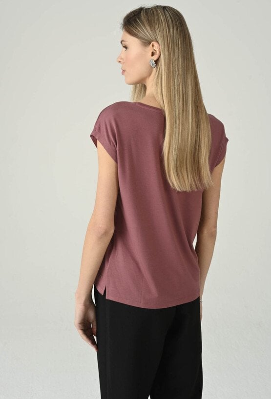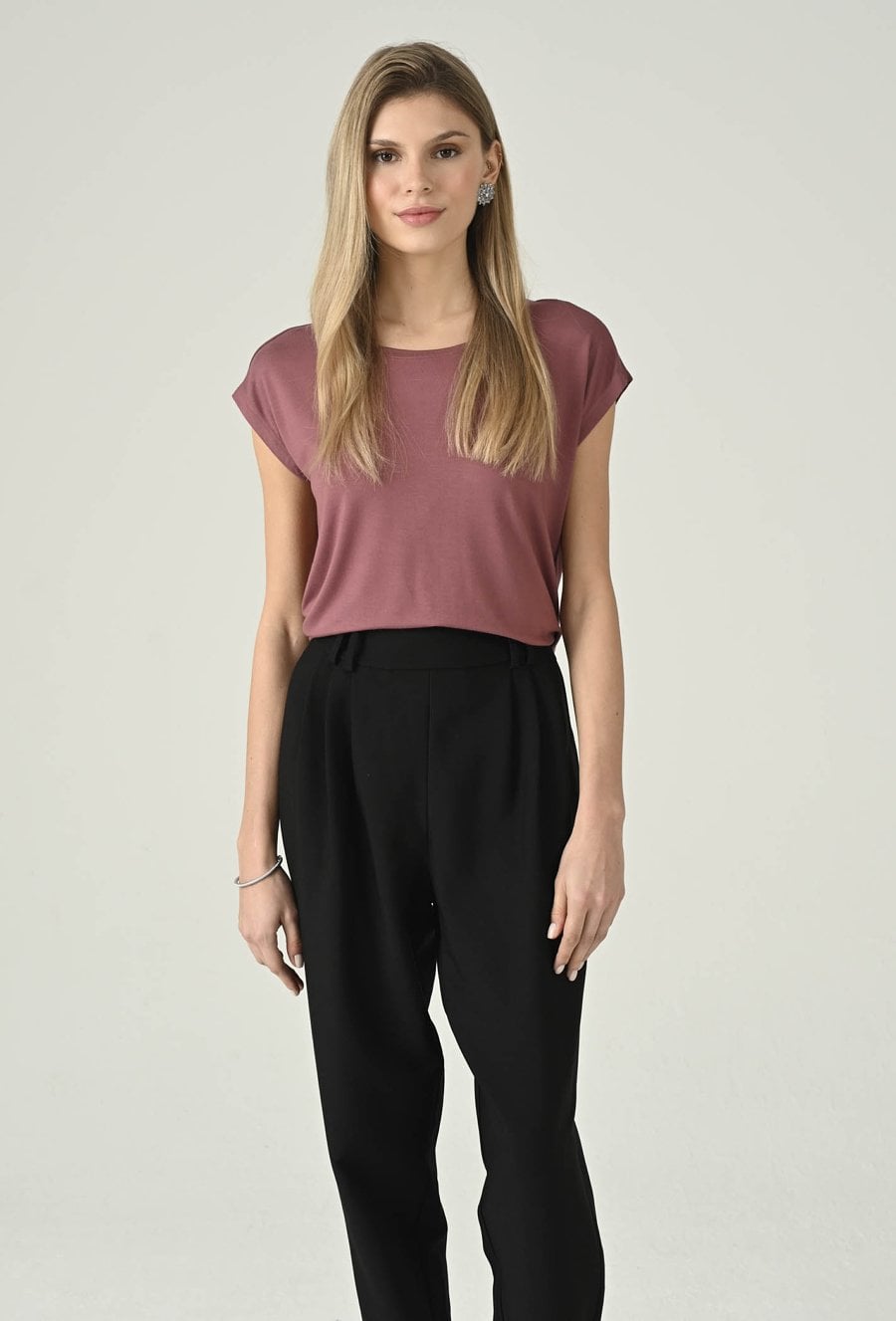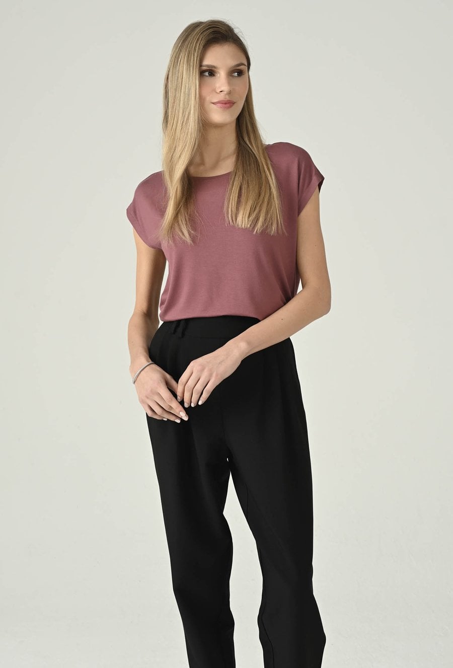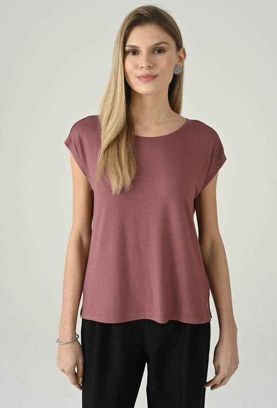 Swobodna bluzka w różowym odcieniu, która świetnie sprawdzi się w codziennych stylizacjach. Klasyczny, okrągły dekolt nadaje jej minimalistyczny charakter, a krótki rękaw podkreśla lekkość i wygodę noszenia. Prosta forma dobrze układa się na sylwetce i zapewnia komfort przez cały dzień, dzięki czemu model doskonale pasuje do wielu zestawów — od jeansów, przez spodnie materiałowe, po spódnice. To uniwersalna baza, którą łatwo wystylizujesz na co dzień i do pracy w mniej formalnym wydaniu.