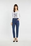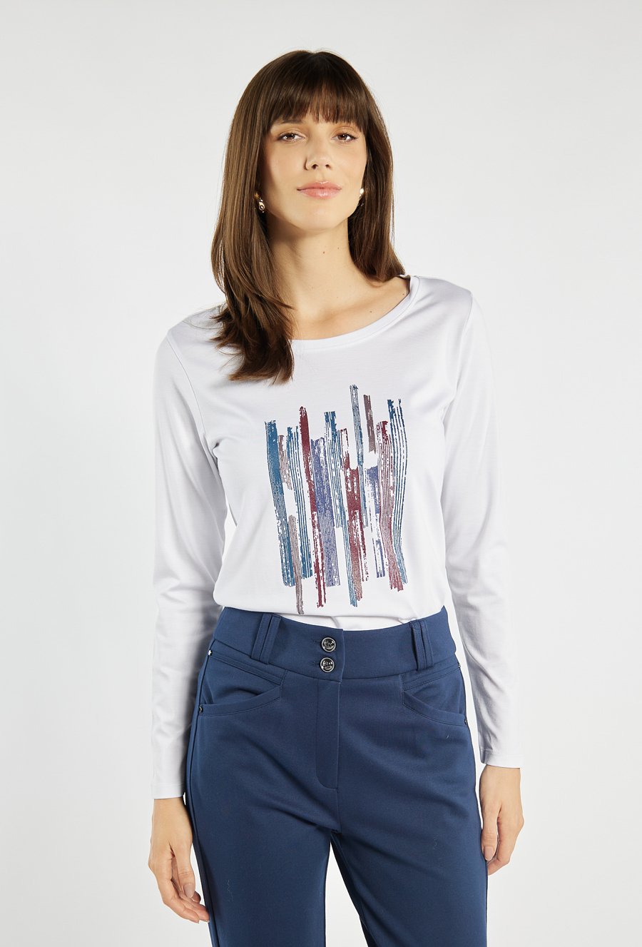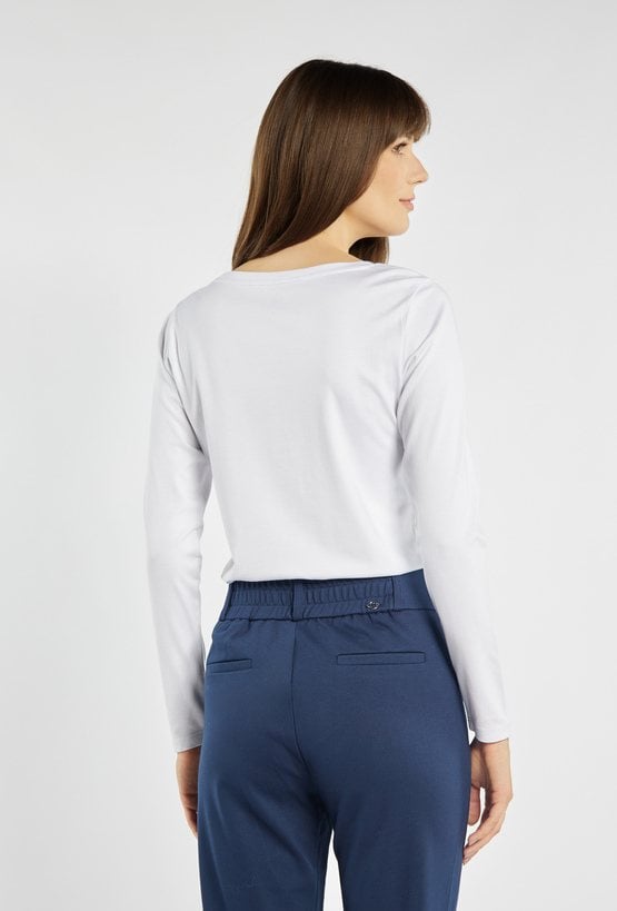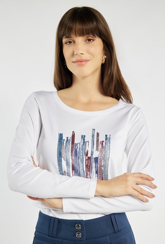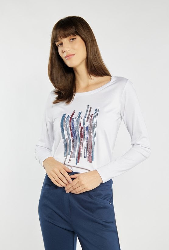 Bluzka z długim rękawem o prostym, wygodnym kroju, urozmaicona efektownym nadrukiem w centralnej części. Delikatny połysk aplikacji dodaje jej nowoczesnego charakteru, a miękki materiał zapewnia komfort noszenia. Uniwersalny model, który dobrze sprawdzi się w codziennych stylizacjach. Modelka na zdjęciu ma 177 cm wzrostu i prezentuje rozmiar S.