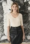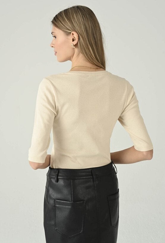 Uniwersalna bluzka w beżowym odcieniu, która łączy codzienny komfort z kobiecą elegancją. Dekolt w kształcie litery V subtelnie podkreśla szyję i optycznie wysmukla górną część sylwetki, a rękaw 3/4 sprawia, że model świetnie sprawdzi się przez cały sezon. Dopasowany fason ładnie układa się na ciele i pozwala swobodnie tworzyć stylizacje — zarówno z jeansami, jak i ze spódnicą czy spodniami materiałowymi. To ponadczasowa baza, po którą będziesz sięgać na co dzień, do pracy i na mniej formalne wyjścia.