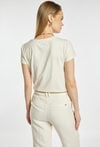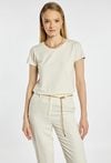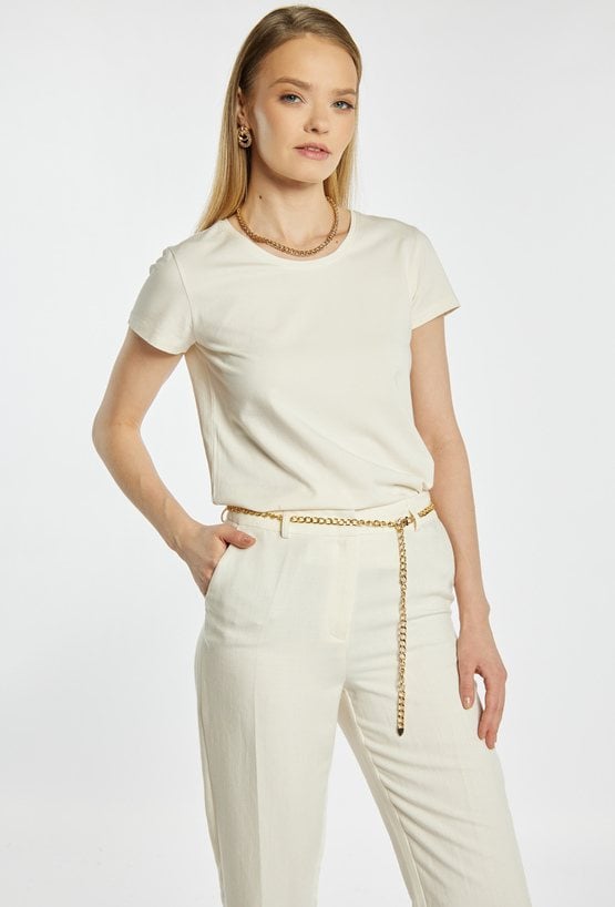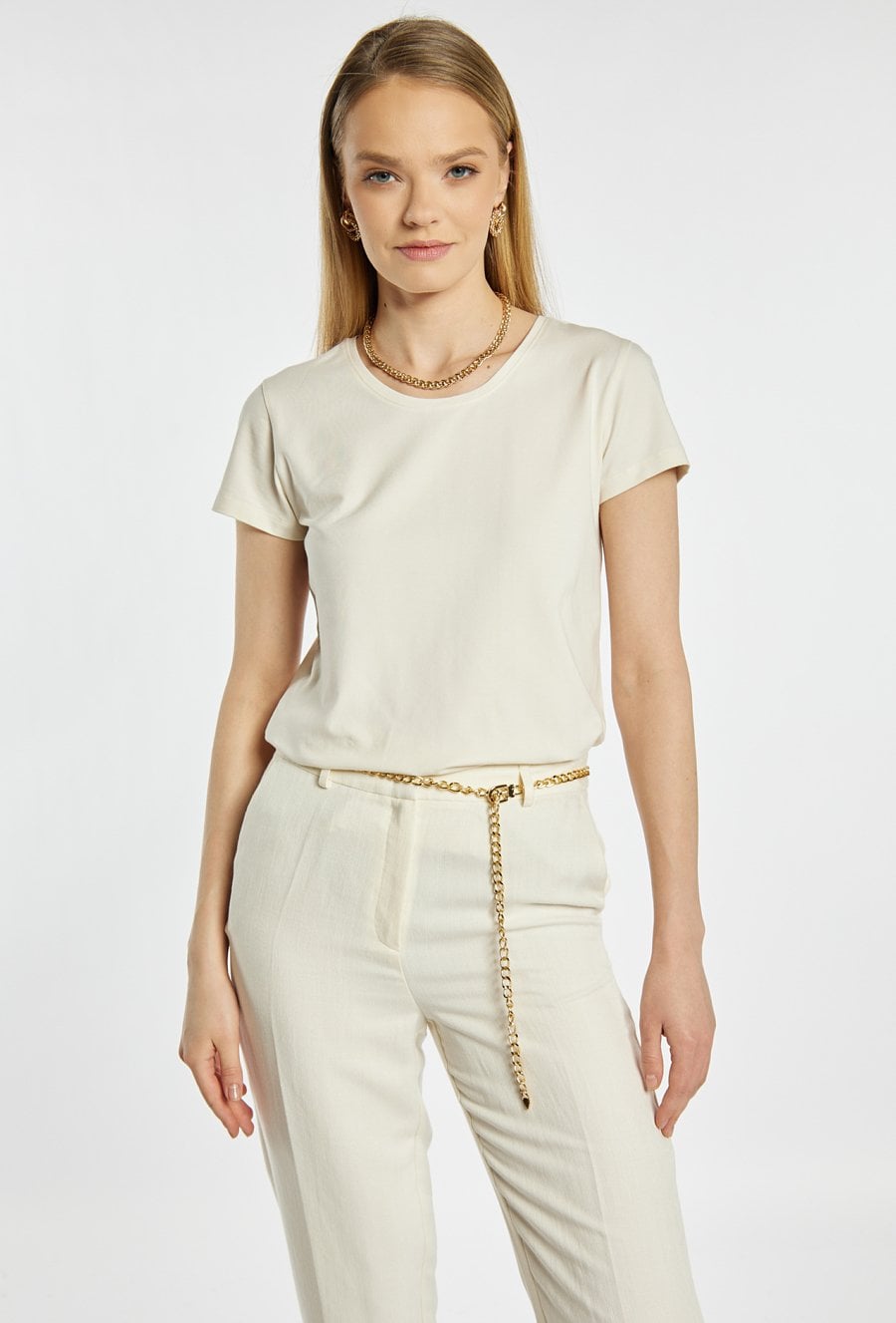 T-shirt damski o klasycznym, prostym kroju. Model z krótkim rękawem oraz okrągłym dekoltem, który subtelnie podkreśla linię szyi. Gładka forma sprawia, że koszulka stanowi doskonałą bazę do wielu stylizacji. Modelka na zdjęciu ma 177 cm wzrostu i prezentuje rozmiar S.