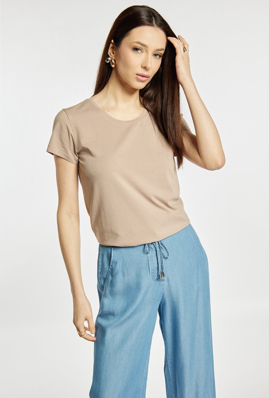 T-shirt damski o klasycznym, prostym kroju. Model z krótkim rękawem oraz okrągłym dekoltem, który subtelnie podkreśla linię szyi. Gładka forma sprawia, że koszulka stanowi doskonałą bazę do wielu stylizacji. Modelka na zdjęciu ma 177 cm wzrostu i prezentuje rozmiar S.