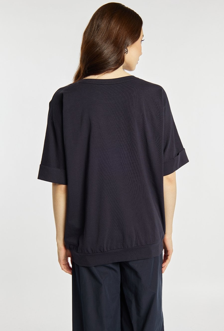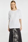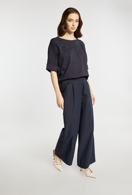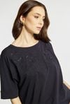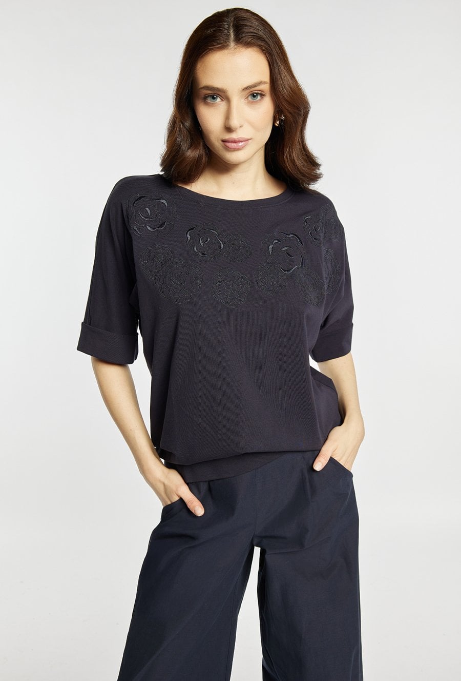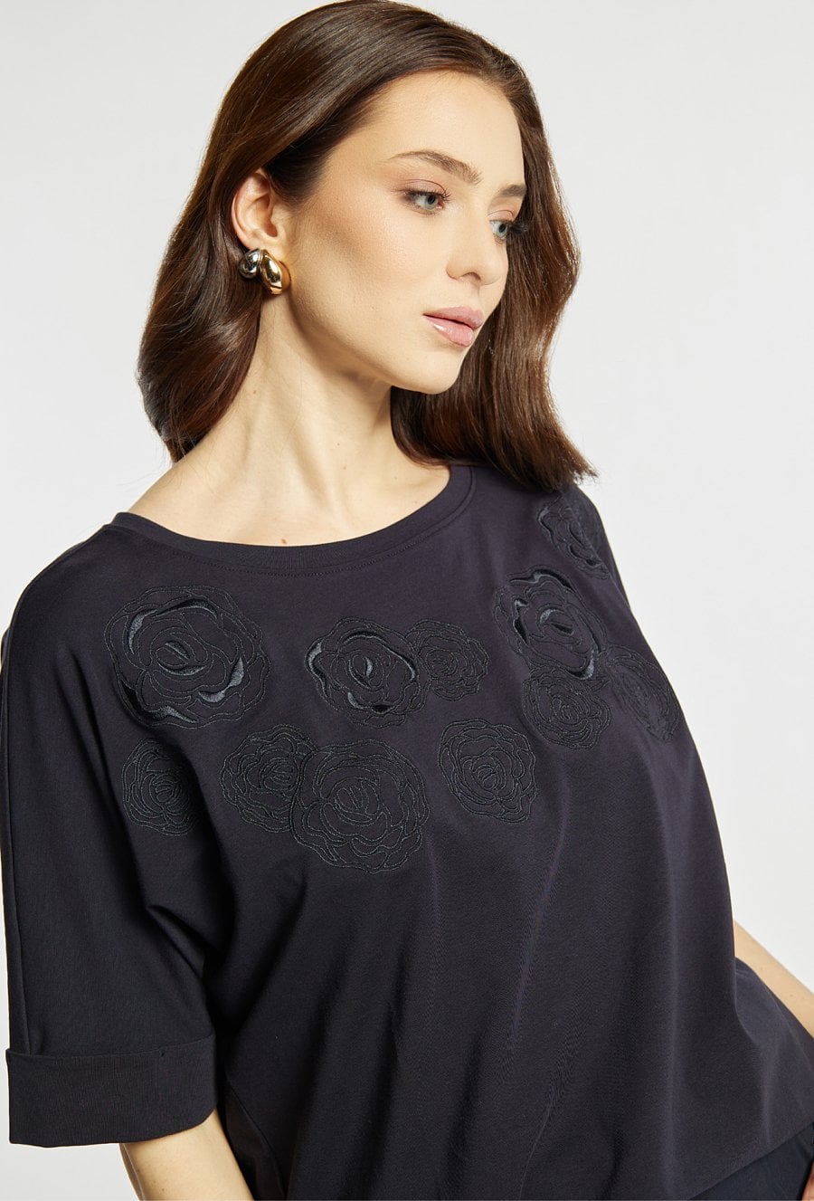 T-shirt o luźniejszym kroju i krótkim rękawie wyróżnia się elegancką aplikacją kwiatową w tonacji materiału, która dodaje mu subtelnego, kobiecego charakteru. Podwinięte rękawy nadają całości nowoczesnego, swobodnego stylu. Model idealny na co dzień i do casualowych zestawów. Modelka na zdjęciu ma 177 cm wzrostu i prezentuje rozmiar S.