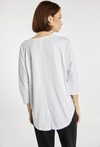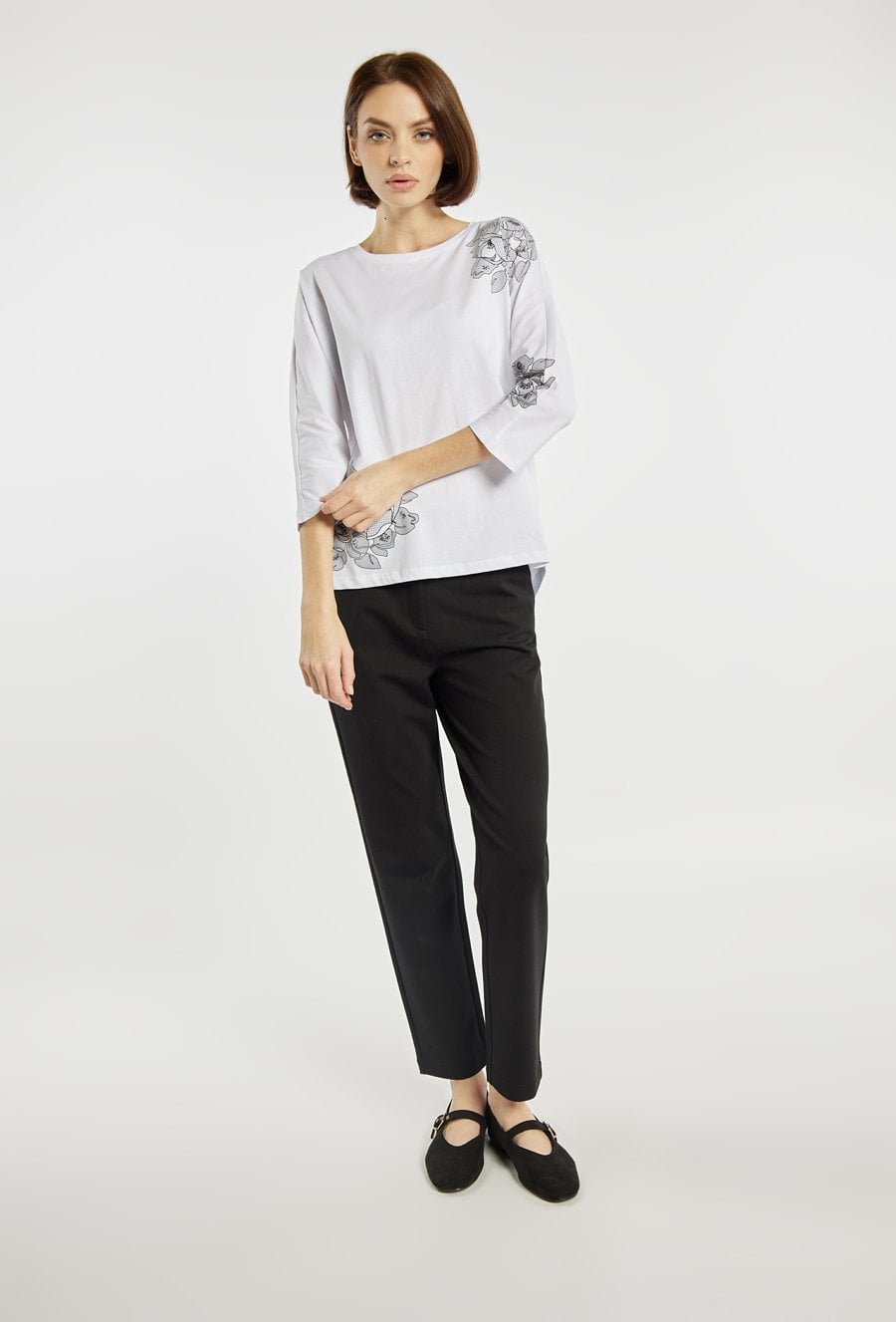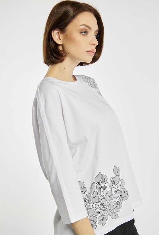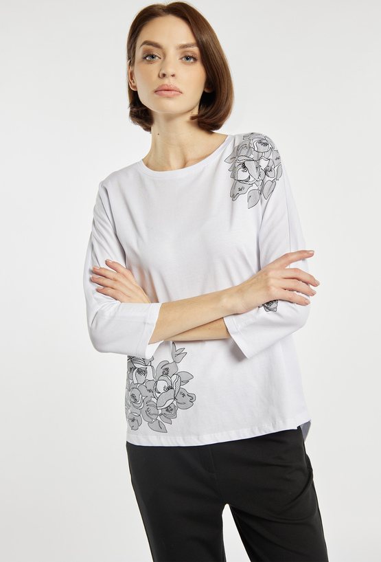 T-shirt o luźnym kroju z rękawem 3/4 wyróżnia się dekoracyjnym, roślinnym nadrukiem umieszczonym asymetrycznie, który nadaje całości subtelnego, kobiecego charakteru. Model idealny na co dzień, łatwy do zestawienia zarówno ze spodniami, jak i spódnicą. Modelka na zdjęciu ma 177 cm wzrostu i prezentuje rozmiar S.