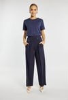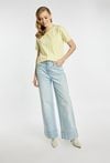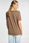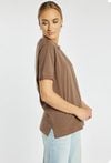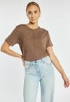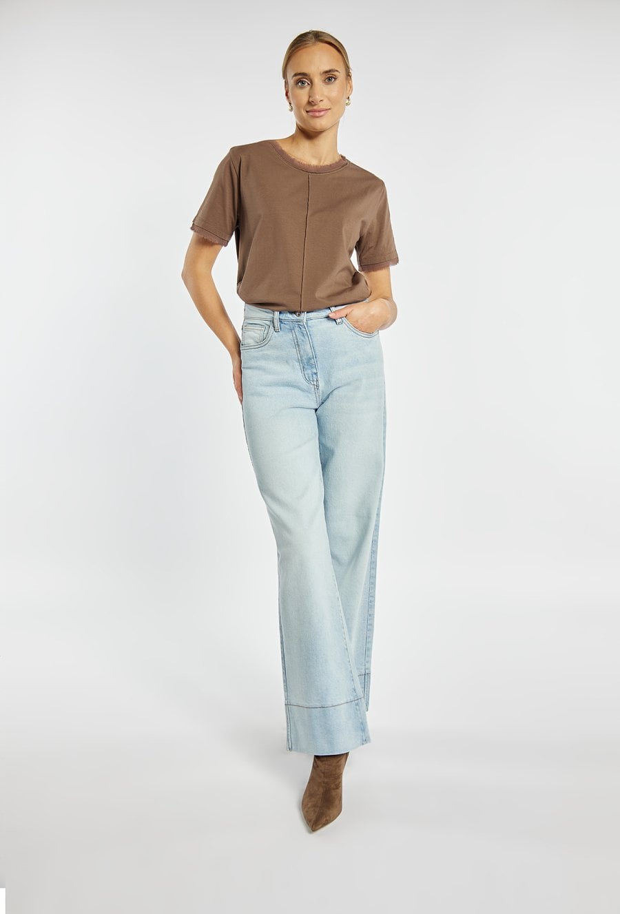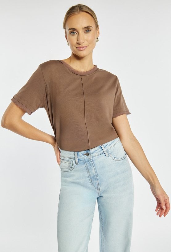 T-shirt damski z krótkim rękawem i półokrągłym dekoltem wyróżnia się ozdobnym przeszyciem z przodu oraz surowym wykończeniem brzegów, które dodają mu nowoczesnego charakteru. T-shirt o prostym kroju, idealny do codziennych stylizacji. Modelka na zdjęciu ma 177 cm wzrostu i prezentuje rozmiar S.