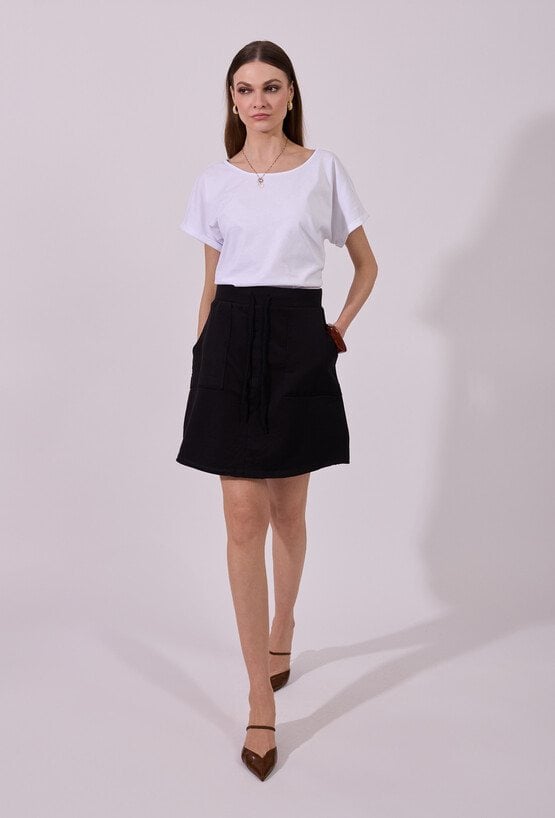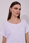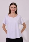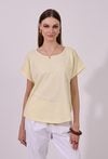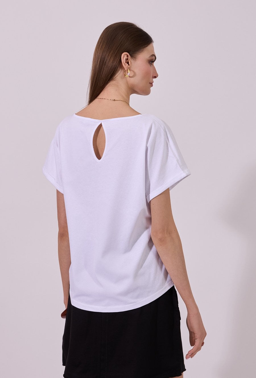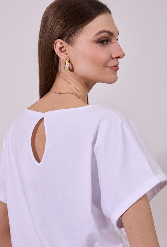 T-shirt damski o luźnym, komfortowym kroju z krótkim rękawem. Model z klasycznym, okrągłym dekoltem oraz podwiniętymi rękawami, które nadają całości swobodnego charakteru. Minimalistyczny fason sprawia, że świetnie sprawdzi się jako baza codziennych stylizacji. Modelka na zdjęciu ma 177 cm wzrostu i prezentuje rozmiar S.