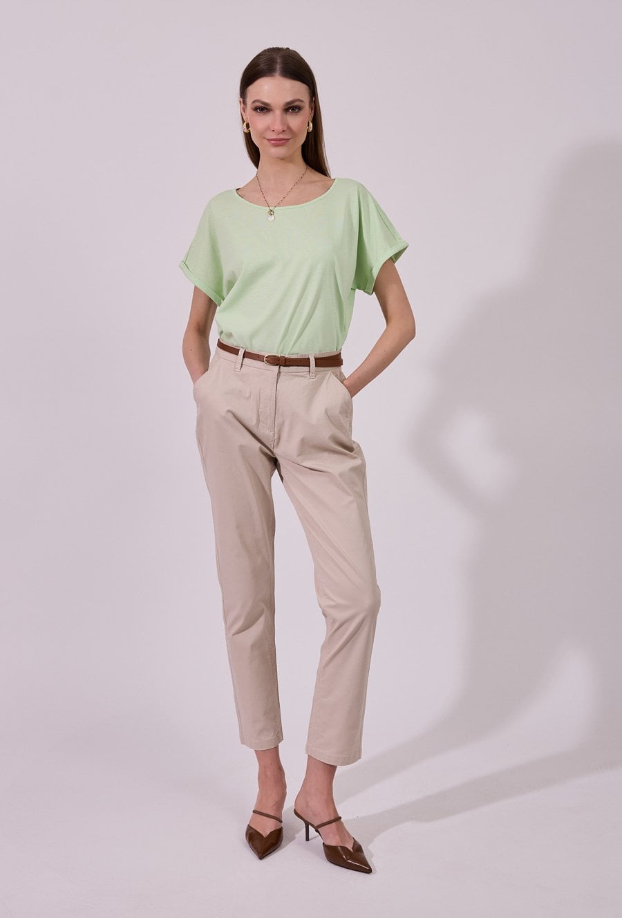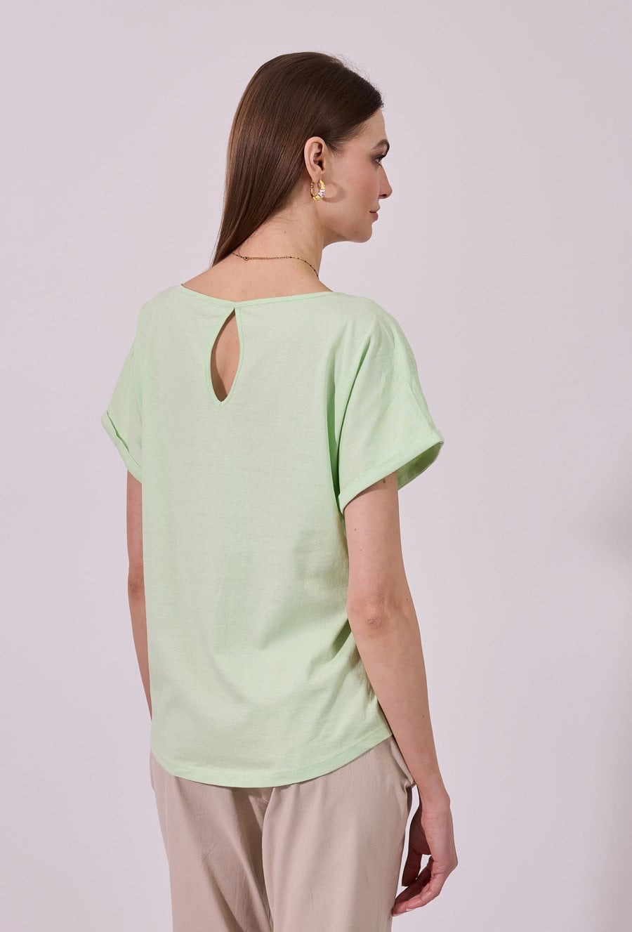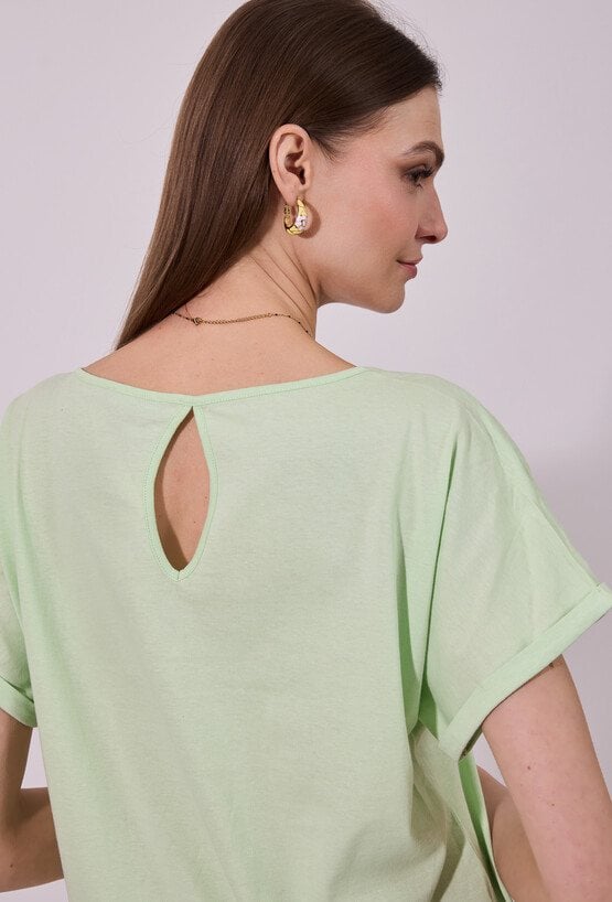T-shirt damski o luźnym, komfortowym kroju z krótkim rękawem. Model z klasycznym, okrągłym dekoltem oraz podwiniętymi rękawami, które nadają całości swobodnego charakteru. Minimalistyczny fason sprawia, że świetnie sprawdzi się jako baza codziennych stylizacji. Modelka na zdjęciu ma 177 cm wzrostu i prezentuje rozmiar S.