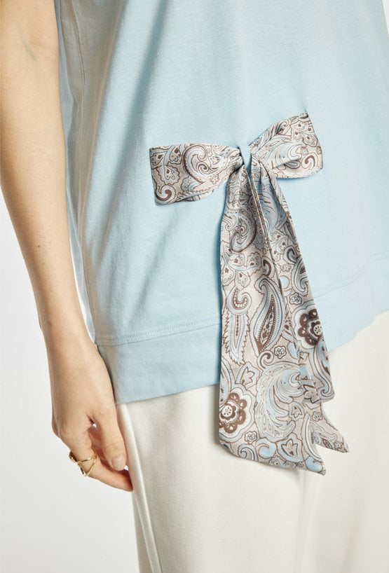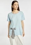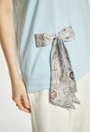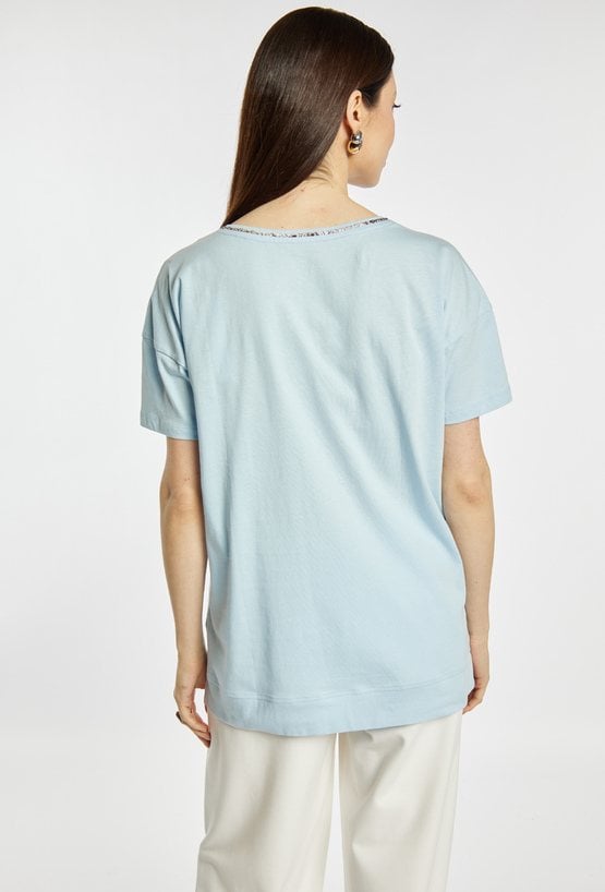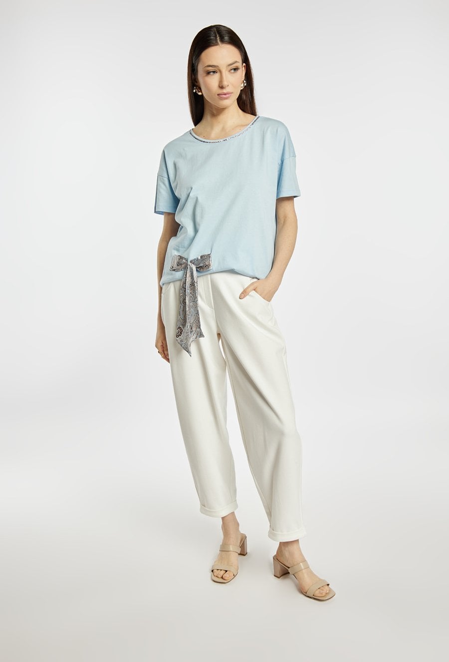 T-shirt damski o prostym, swobodnym kroju. Model z krótkim rękawem i okrągłym dekoltem, delikatnie wykończonym subtelną ozdobną lamówką. Całość uzupełnia dekoracyjna szarfka w pasie, która dodaje stylizacji lekkości i kobiecego charakteru. Modelka na zdjęciu ma 177 cm wzrostu i prezentuje rozmiar S.