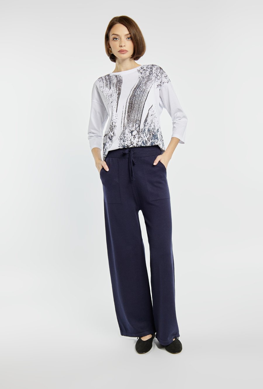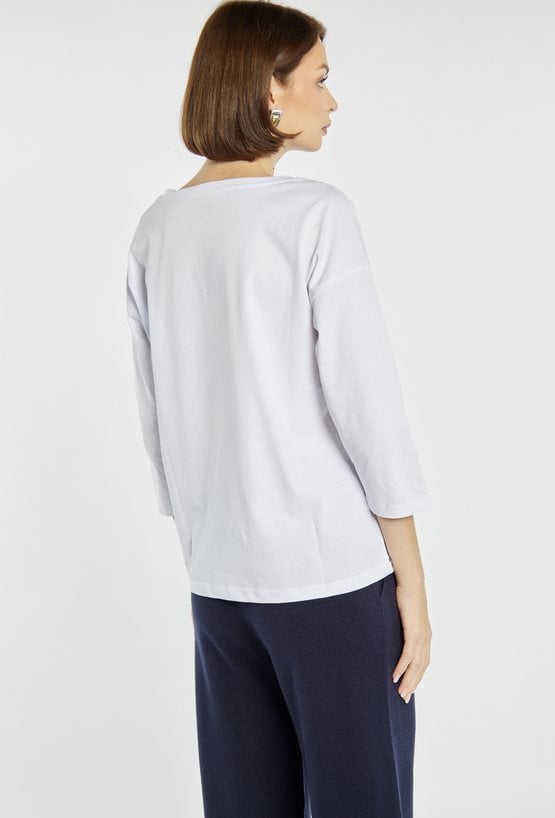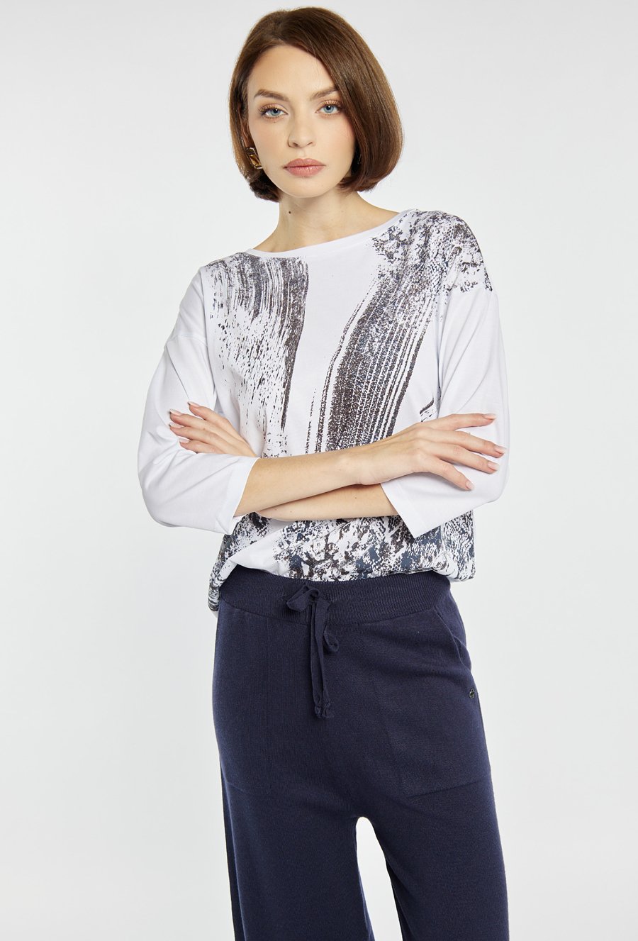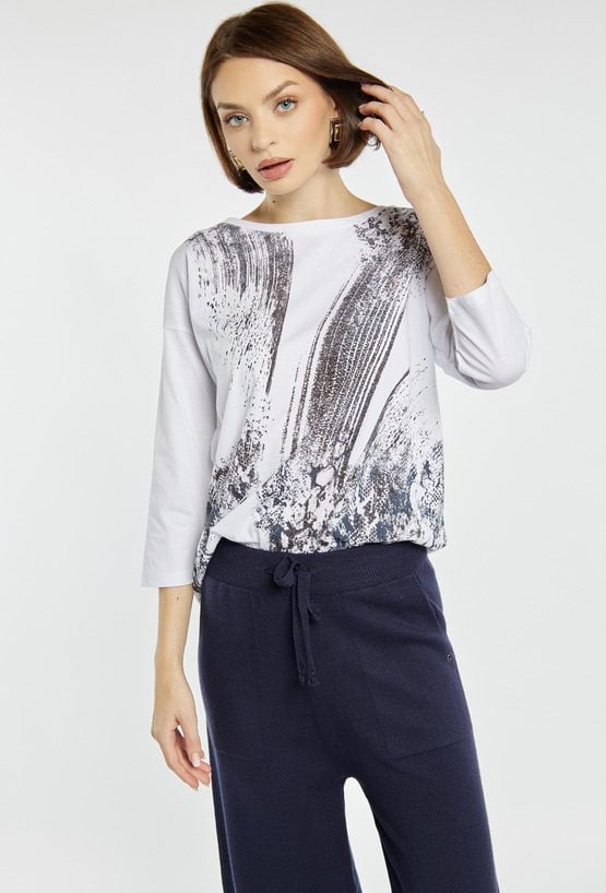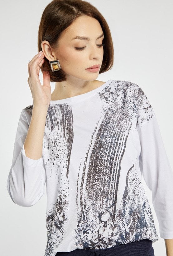 T-shirt z artystycznym nadrukiem na przodzie. Luźniejszy fason i rękawy o długości 3/4 zapewniają swobodę i wygodę noszenia. Doskonale komponuje się zarówno z eleganckimi spodniami, jak i casualową spódnicą, tworząc nowoczesny, stylowy look. Modelka na zdjęciu ma 177 cm wzrostu i prezentuje rozmiar S.