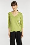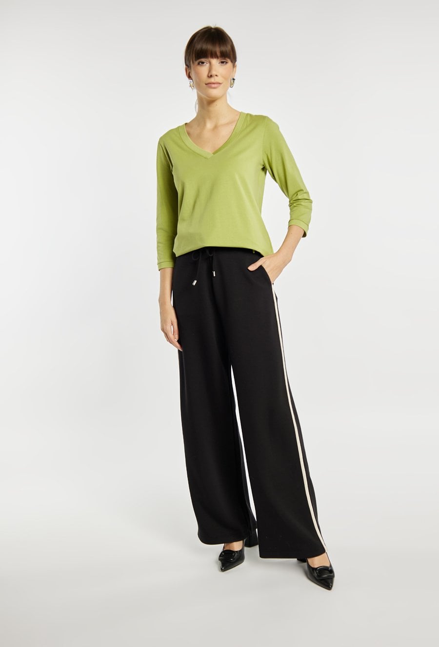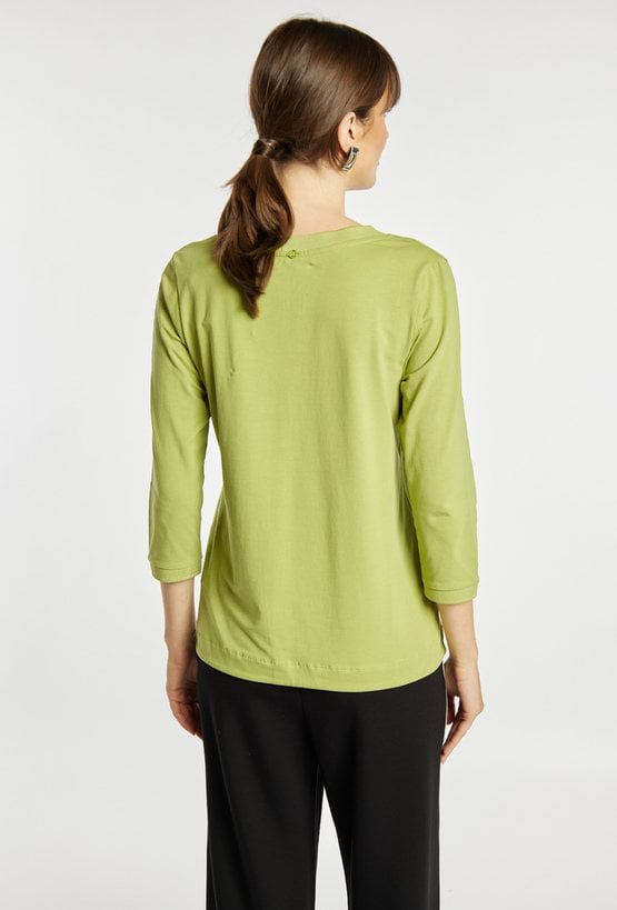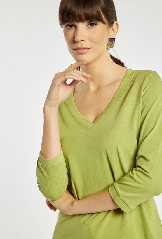 T-shirt z dekoltem V wykończonym kontrastową lamówką, który subtelnie podkreśla linię szyi. Model ma rękaw 3/4 oraz dół regulowany troczkiem, dzięki czemu można łatwo dopasować fason do sylwetki. Lekki, wygodny i idealny do codziennych, swobodnych stylizacji. Modelka na zdjęciu ma 177 cm wzrostu i prezentuje rozmiar S.