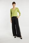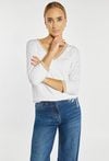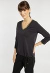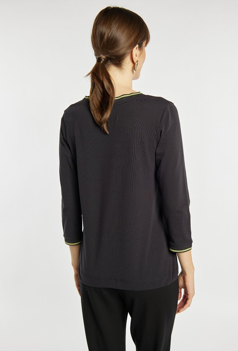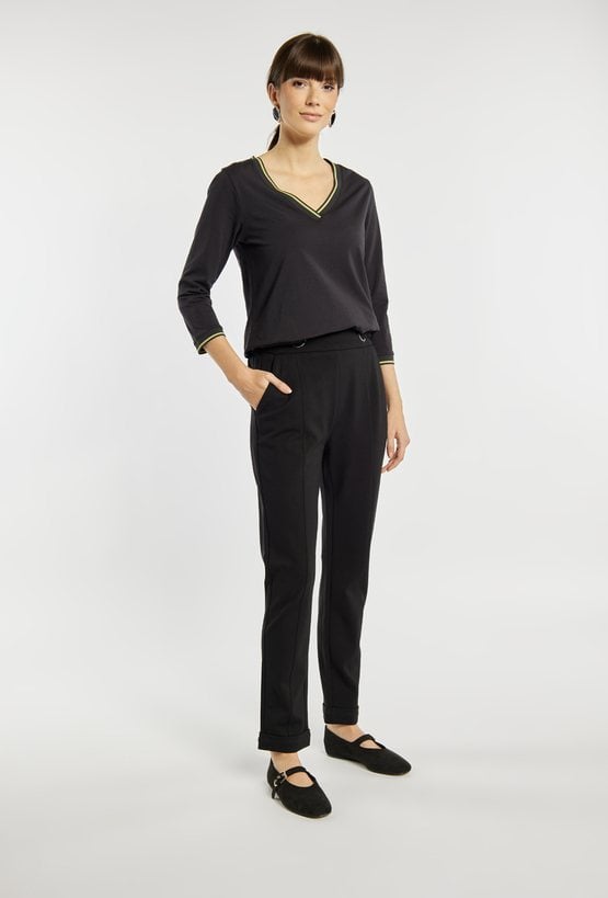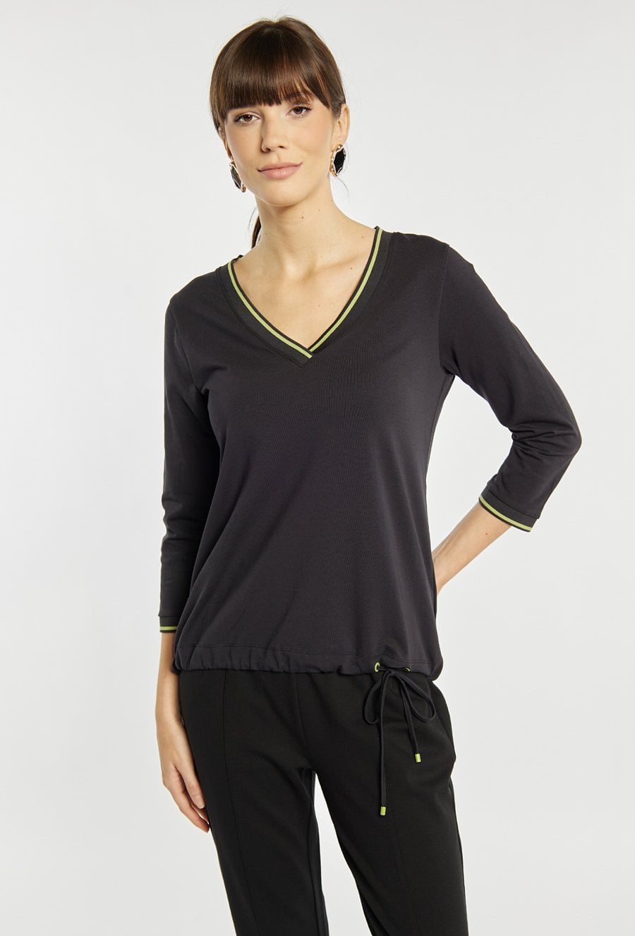 T-shirt z dekoltem V wykończonym kontrastową lamówką, który subtelnie podkreśla linię szyi. Model ma rękaw 3/4 oraz dół regulowany troczkiem, dzięki czemu można łatwo dopasować fason do sylwetki. Lekki, wygodny i idealny do codziennych, swobodnych stylizacji. Modelka na zdjęciu ma 177 cm wzrostu i prezentuje rozmiar S.