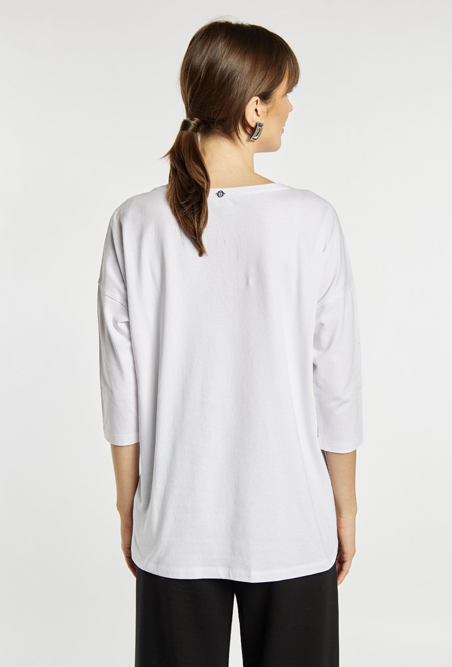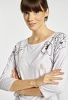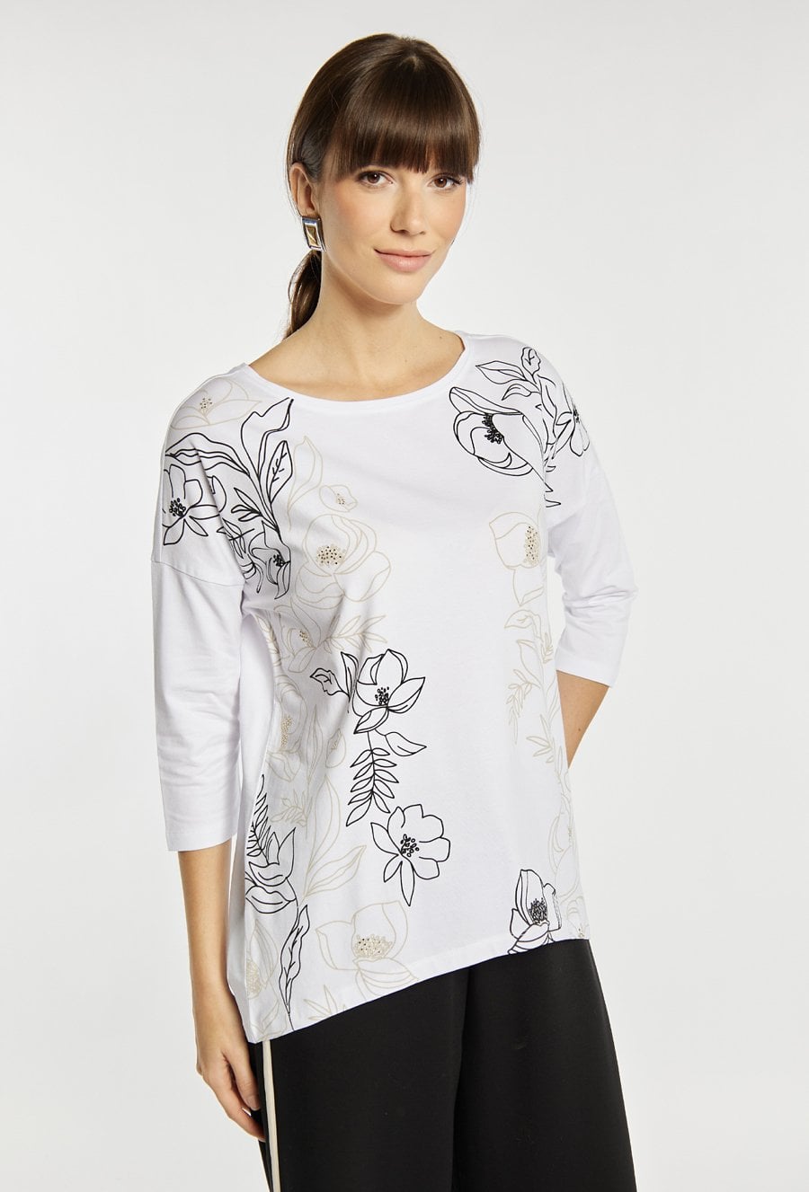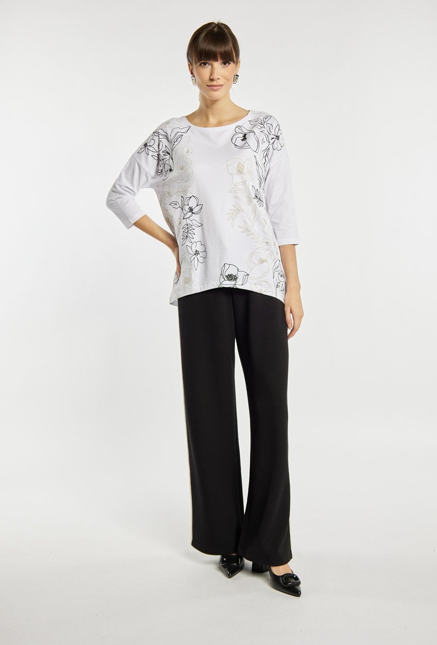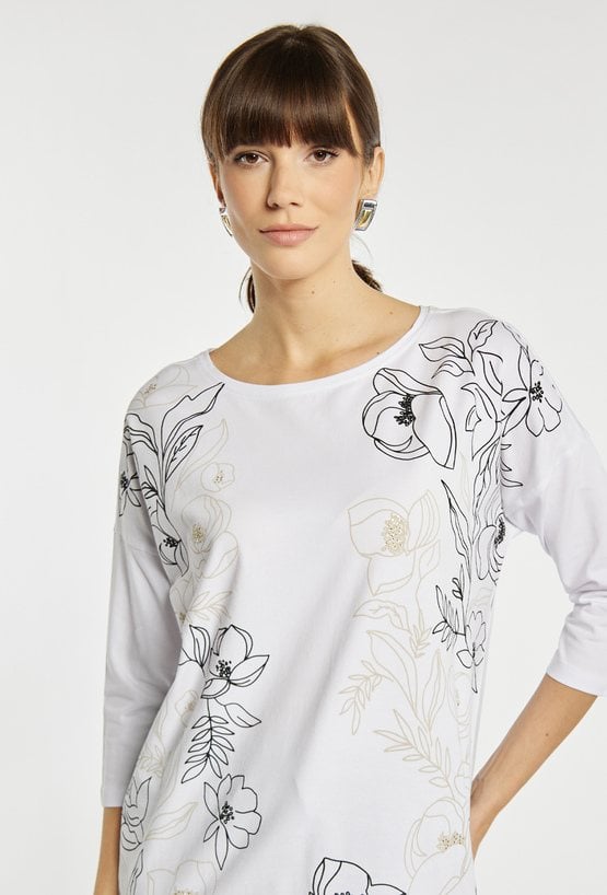 T-shirt damski o swobodnym kroju z dekoracyjnym, roślinnym nadrukiem na przodzie. T-shirt ma okrągły dekolt oraz rękawy o długości 3/4, zapewniając wygodę na co dzień. T-shirt świetnie uzupełni codzienne stylizacje, dodając im lekkiego, kobiecego charakteru. Modelka na zdjęciu ma 177 cm wzrostu i prezentuje rozmiar S.