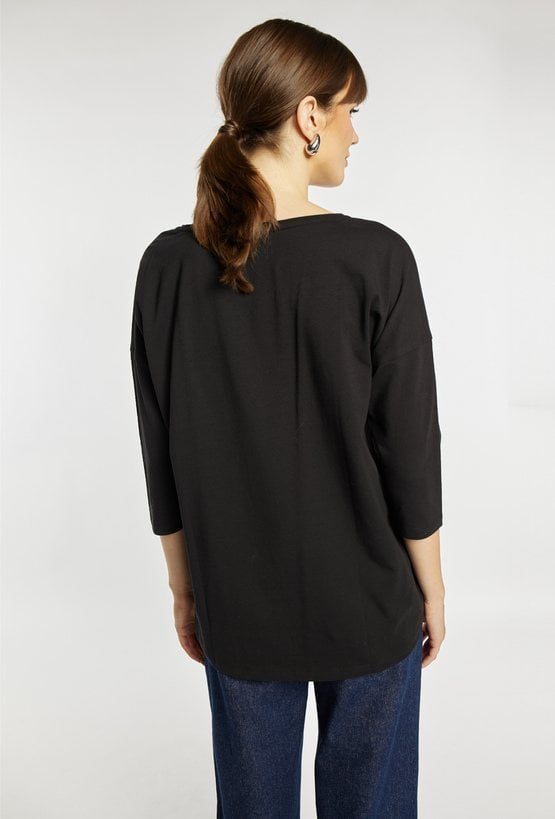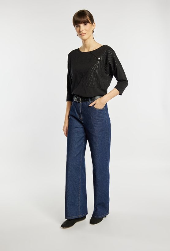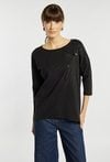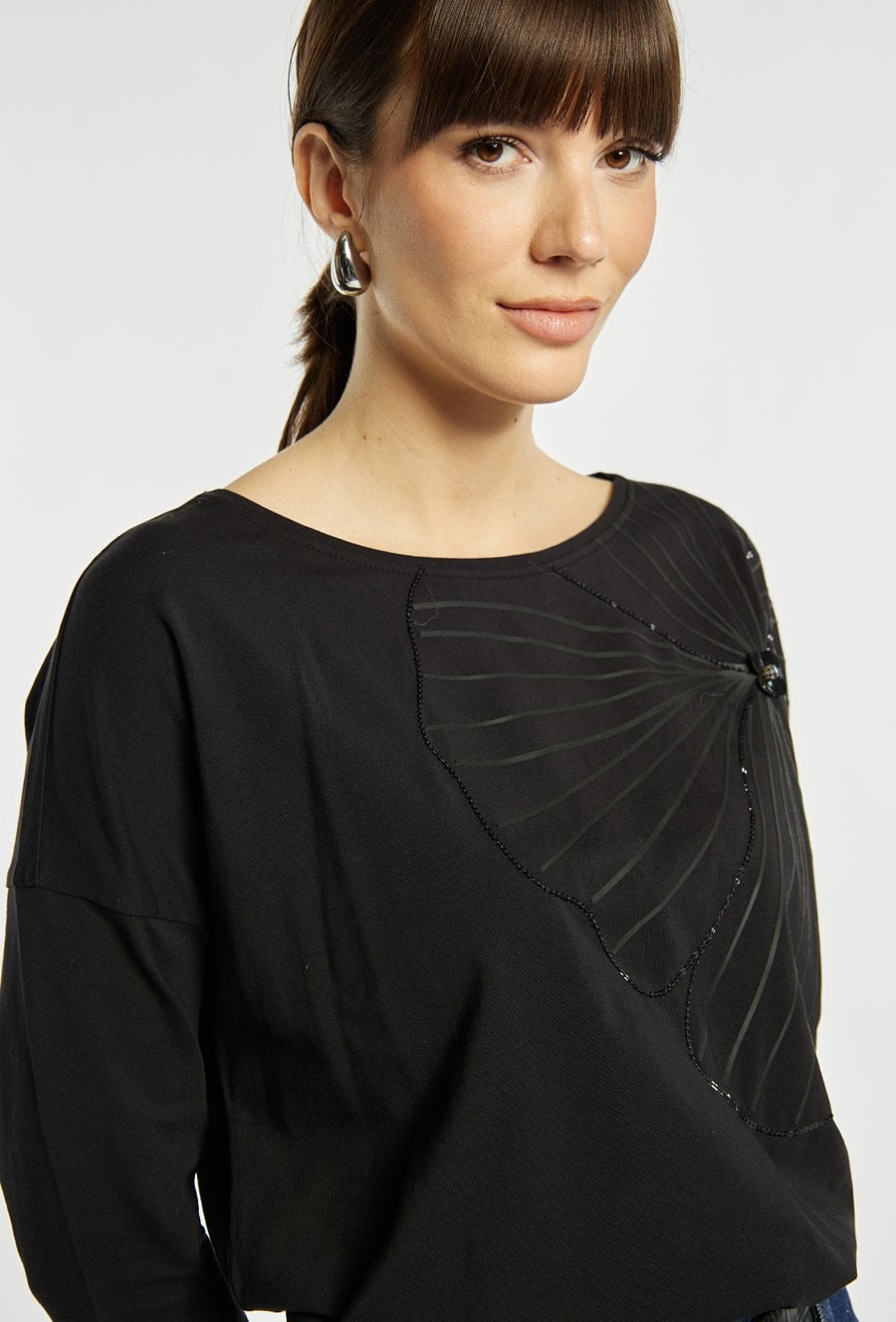T-shirt o klasycznym kroju z rękawem 3/4, wzbogacony efektowną aplikacją na przodzie. Duży, plisowany motyw tworzy elegancki, trójwymiarowy akcent, a połyskujące detale dodają delikatnego blasku. T-shirt świetnie pasuje zarówno do jeansów, jak i bardziej wyjściowych stylizacji. Modelka na zdjęciu ma 177 cm wzrostu i prezentuje rozmiar S.