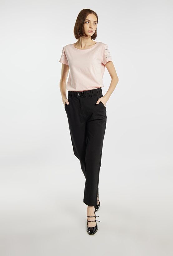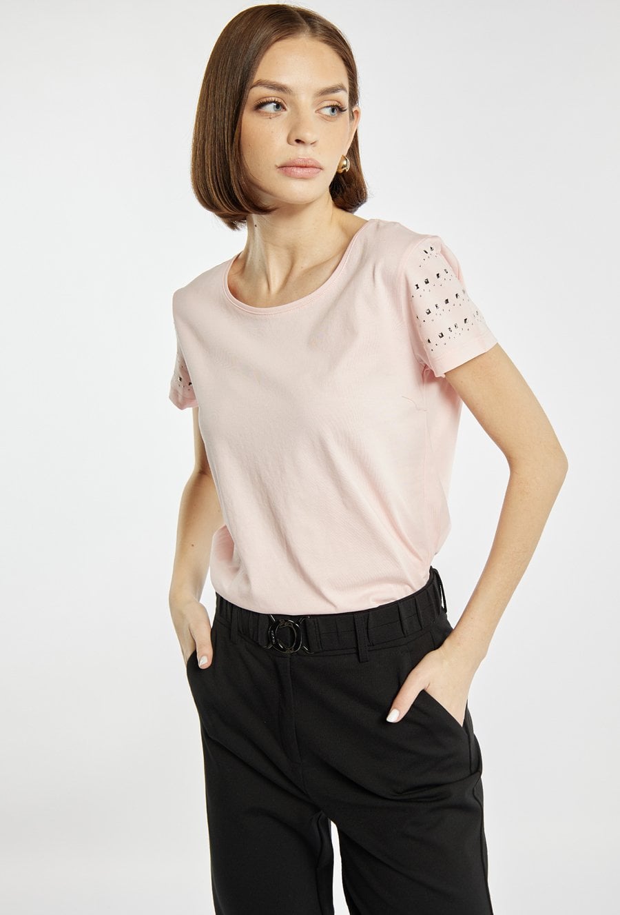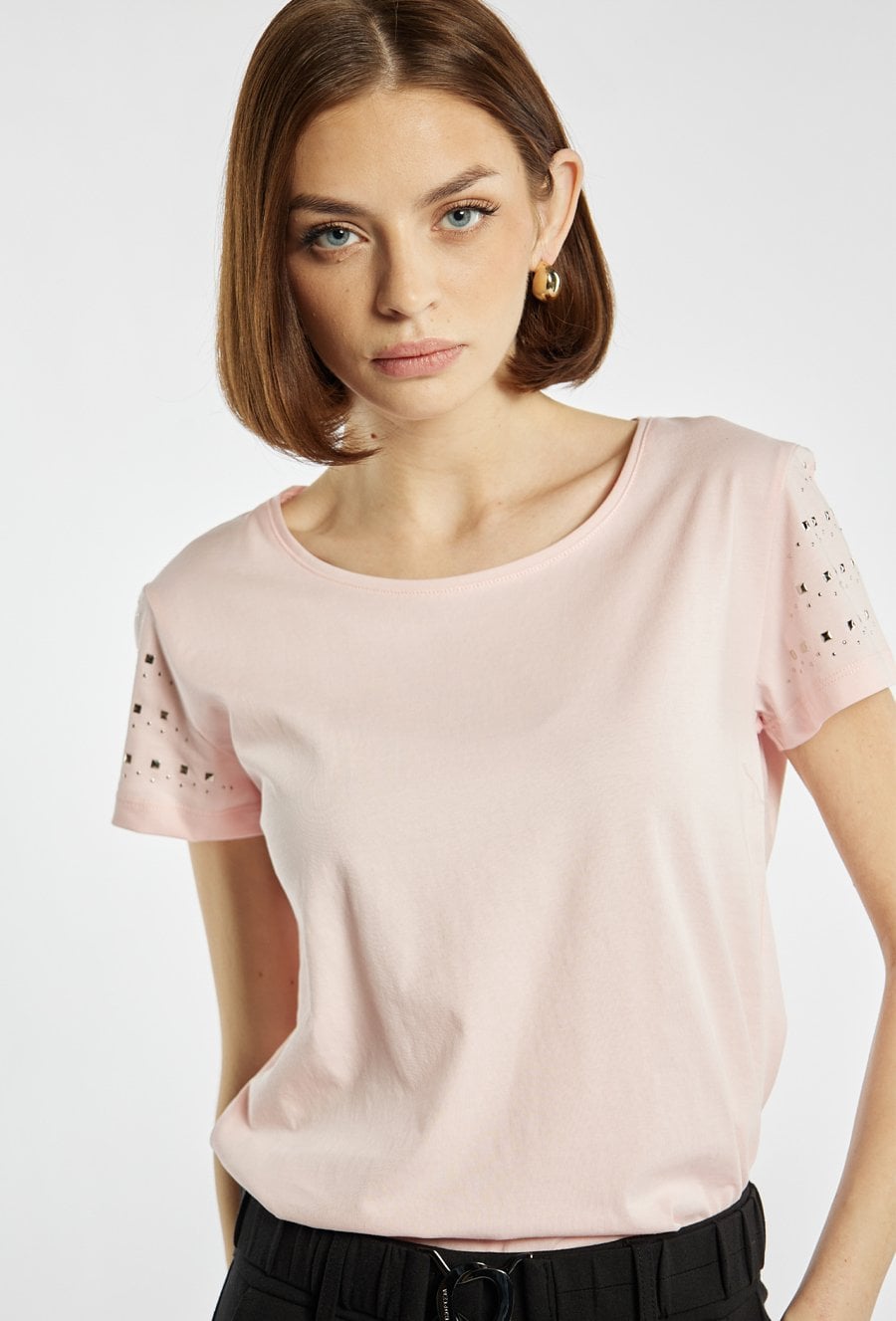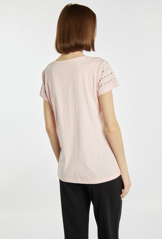 T-shirt damski o prostym, klasycznym kroju, wykonany z lekkiego i przyjemnego w dotyku materiału. Model z krótkim rękawem i okrągłym dekoltem, ozdobiony subtelnymi aplikacjami na rękawach, które nadają całości delikatnego, kobiecego charakteru. Modelka na zdjęciu ma 177 cm wzrostu i prezentuje rozmiar S
