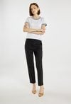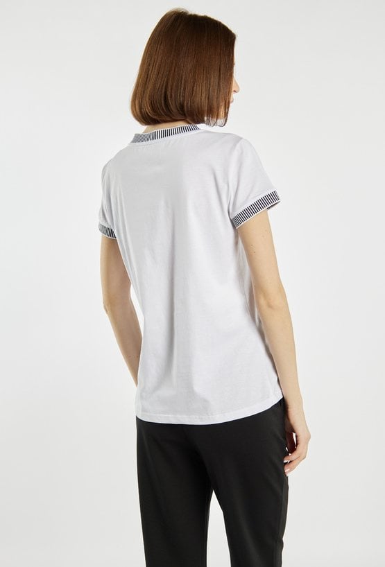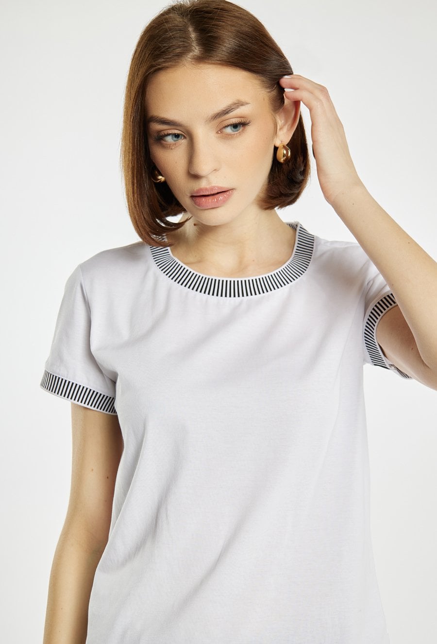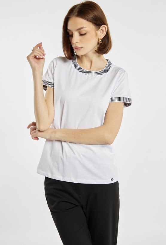 T-shirt damski o prostym, klasycznym kroju. Model z krótkim rękawem i okrągłym dekoltem, wykończonym kontrastową lamówką, która dodaje całości eleganckiego charakteru. Subtelne detale przy rękawach podkreślają nowoczesny styl. T-shirt dobrze układa się na sylwetce i sprawdzi się zarówno w codziennych zestawach, jak i w bardziej dopracowanych stylizacjach, np. ze spodniami materiałowymi lub spódnicą. Modelka na zdjęciu ma 177 cm wzrostu i prezentuje rozmiar S