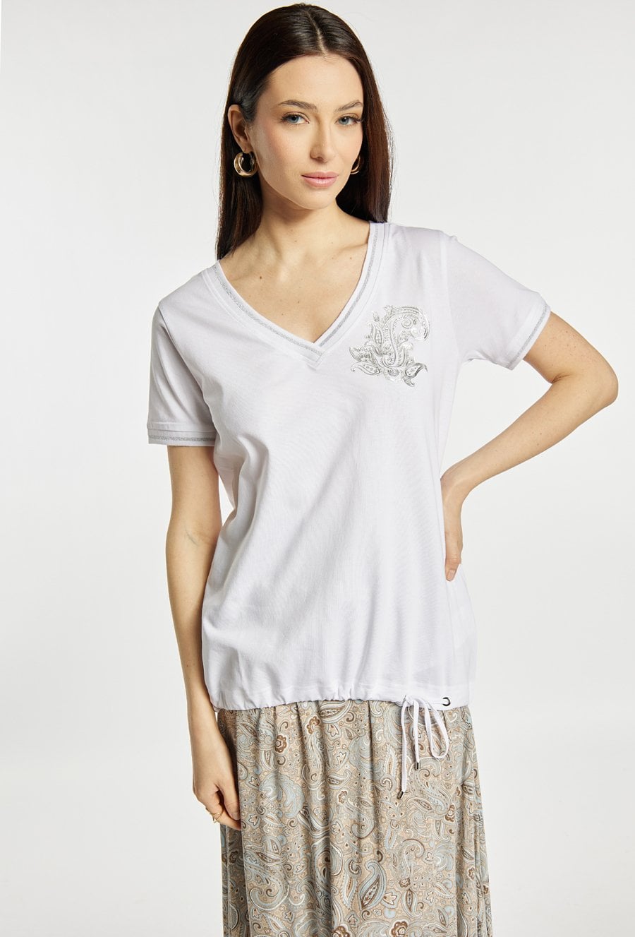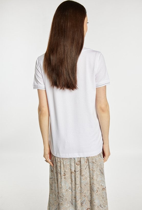 T-shirt damski o swobodnym kroju. T-shirt z krótkim rękawem oraz dekoltem w kształcie litery V, wykończonym subtelną lamówką. Na przodzie znajduje się delikatny, jasny wzór, który nadaje całości eleganckiego charakteru. Dół wykończony ściągaczem z wiązaniem. Modelka na zdjęciu ma 177 cm wzrostu i prezentuje rozmiar S.